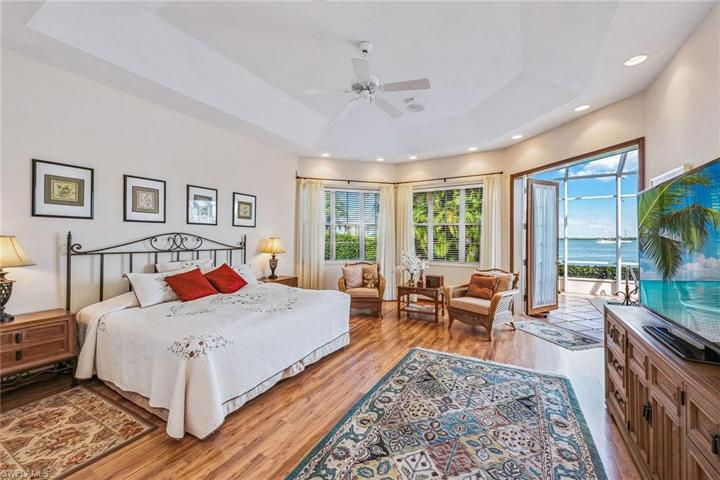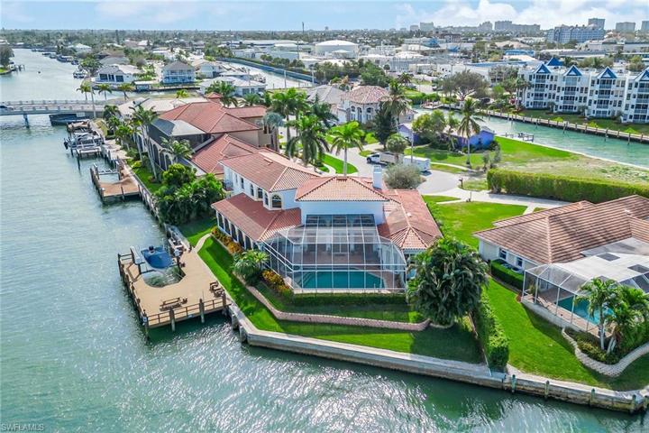 Unparalleled bay views on a coveted Marco Island cul-de-sac lot with direct Gulf access. Step through museum-style doors into a spacious open living area, complemented by 4 bedrooms plus den, and 6 bathrooms. The interior showcases soaring 21-ft ceilings, crown molding, 8-ft doors, and ceramic tile floors throughout. The fully equipped kitchen features wood cabinets, walk-in pantry, and direct access to lanai. The dining and living rooms are awe-inspiring with expansive two-story tall ceilings, wood burning fireplace, and wet bar, all accentuated by stunning water vistas. The owner’s suite features luxury vinyl plank flooring, large walk-in closet, and his/her en-suite bathrooms, offering the ultimate in privacy and comfort. The covered, screened lanai is a masterpiece, with an exposed rafter ceiling, heated pool and spa, water fountain, coal BBQ and hood, pool bathroom and outdoor shower, and captivating views. The private dock is a boater’s dream, featuring a boat lift, fish cleaning table, and a seawall. Additional amenities include in-ceiling speaker system, central vacuum, security system, circular paver driveway, and two-car garage.