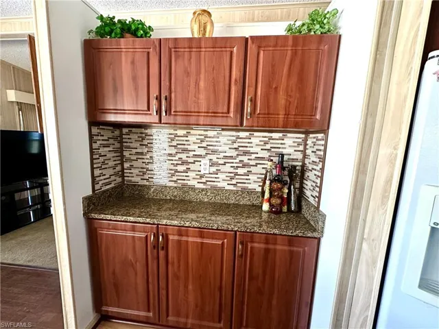 This turnkey two-bedroom, two-bath home is situated on an oversized lot in the Imperial Harbor 55+ community. Cathedral ceilings enhance the open feel of the home, while bay windows surround the dining room, filling the space with natural light. The kitchen features granite countertops, a side-by-side refrigerator with icemaker, dishwasher, glass-top stove with Wi-Fi capabilities, a coffee bar with ample storage, and a built-in desk. The master bedroom includes both a walk-in and additional closet. The living room offers a cozy fireplace and opens to a screened Florida room, accessible through sliding doors or its own exterior entrance. The utility room is equipped with a washer, dryer, and sink. Major updates include a roof replacement in 2020 and a new AC unit in 2019. Located just seven minutes from the beach and close to golf courses and shopping centers. This home also comes with a golf cart and Harbor Club membership. Enjoy access to community amenities such as a heated pool, fitness center, library, pickleball, bocce, shuffleboard, billiards, and more.