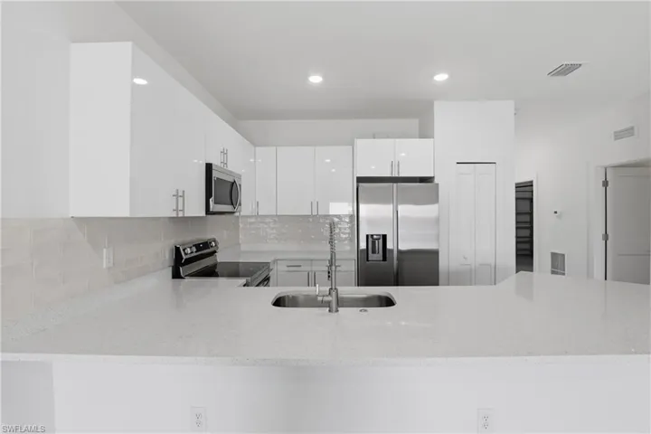 The beautiful kitchen is the heart of the home, showcasing sleek quartz countertops, modern cabinetry, stainless steel appliances, and a spacious breakfast bar perfect for casual dining or entertaining guests.