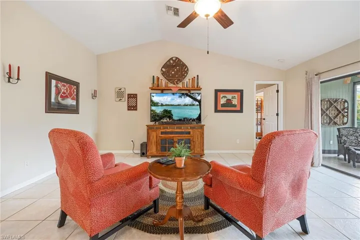 Welcome to River Bend, a highly desirable community in North Fort Myers! This well maintained 3 bedroom plus den, 2 bathroom home features double front doors that open into a bright, open layout with vaulted ceilings, tile flooring in the main living areas, and great natural light throughout.