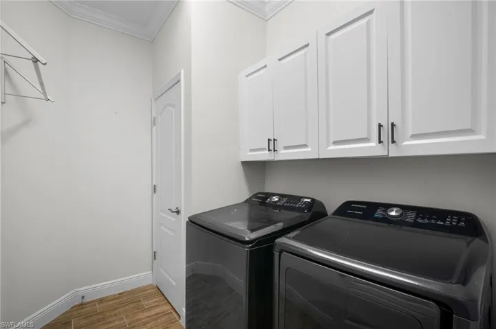 Experience the ultimate in coastal luxury in this meticulously maintained coach home within the exclusive, gated enclave of Avalon of Naples. This bright, open-concept residence lives like a single-family home, featuring durable plank tile flooring and a seamless transition to a large, screened lanai via a wall of glass sliders. The designer kitchen is a chef’s dream, anchored by a custom ship-lap island and outfitted with quartz countertops, upgraded cabinetry with pull-out shelving, and premium stainless appliances. Built for both style and security, the home boasts full hurricane impact windows and doors, plantation shutters, and remote-controlled shades. Every detail has been elevated, from the custom-organized master suite closet to the reinforced storage systems in the garage. Nestled on 17 lush acres with serene lake and preserve views, this pet-friendly community offers a boutique lifestyle just minutes from the world-class dining, shopping, and white-sand beaches of downtown Naples.