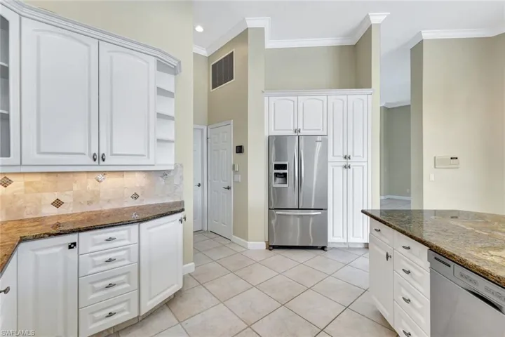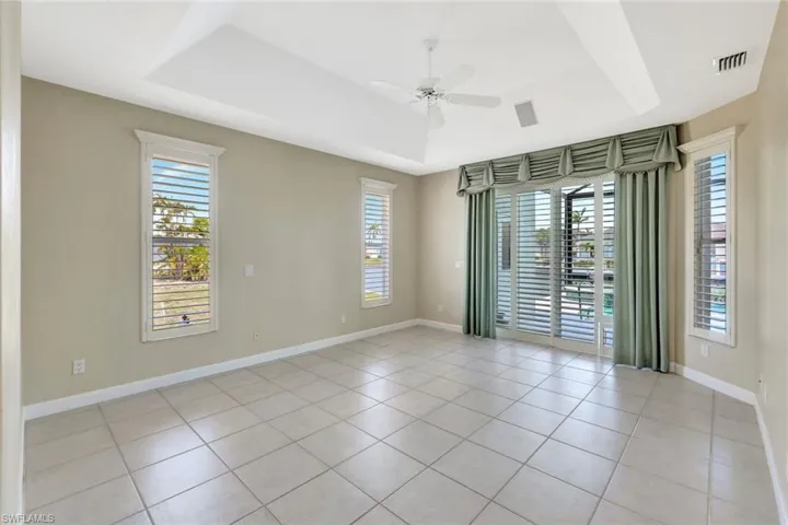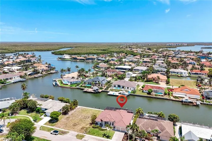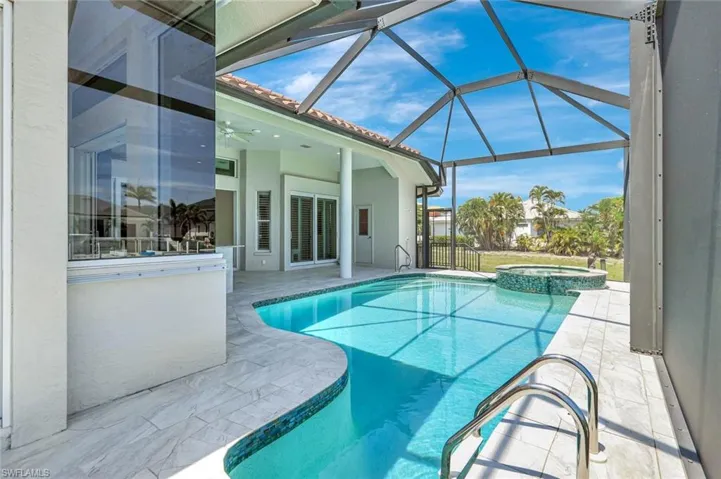 Charming Waterfront Boater’s Retreat with Expansive Views and oodles of Coastal Character, located just three lots from open water in the Marco River neighborhood. This one-owner home offers water frontage on a 150 ft wide canal with beautiful converging waterway views and quick boating water direct access to the Marco River and the Gulf of Mexico. With 2,340 SF under air and 4,330 total SF, this well-designed residence captures the essence of relaxed island living—highlighted by a unique architectural silhouette with multiple sloped rooflines, a new front impact entry door and all new impact window sliders on the rear of the home, a handsomely pavered driveway with fresh sod and landscaped grounds. Step inside to a welcoming foyer and expansive open-concept living and dining spaces that flow seamlessly for entertaining, enhanced by tile flooring throughout and waterfront views from the dining area. French doors lead to a beautiful built-in office with custom cabinetry, while the light-filled kitchen features gorgeous countertops, a walk-in pantry, stainless GE Profile and KitchenAid appliances, a tasteful tile backsplash, and a breakfast bar area with wine cooler open to the family room. The split-bedroom floor plan is ideal for privacy. Two bedrooms on one side are tucked behind a pocketing slider, creating a private guest wing—one with tranquil water views. On the opposite side, the spacious primary suite features a tray ceiling, lanai access, custom built-ins in the walk-in closet, and a spa-like bath with dual vanities, jetted soaking tub, separate shower, and charming trompe-l’œil wall detail. Outdoor living shines with a 30-foot covered lanai, a beautifully tiled 65-foot pool deck, and a 2020 picture window screen enclosure framing the long and wide waterway, gas-heated pool, spa, outdoor shower, and dedicated pool 1/2 bath. An outdoor summer kitchen with built-in grill and fridge completes the scene. The U-shaped dock includes a lift, power, water, a fish-cleaning table, and snook lights. Additional highlights include a 25kW whole-house gas generator, buried propane tank and a 2nd propane tank dedicated to the pool, impact-rated sliders across the rear, some manual storm protection, whole-house water filtration, and an epoxy-floor garage with built-ins and bike racks. This unfurnished home is ready for you to personalize and enjoy—an exceptional value for a waterfront property with sweeping views on Marco Island. Let this be the next chapter in your island lifestyle.