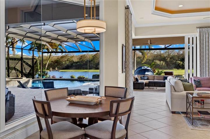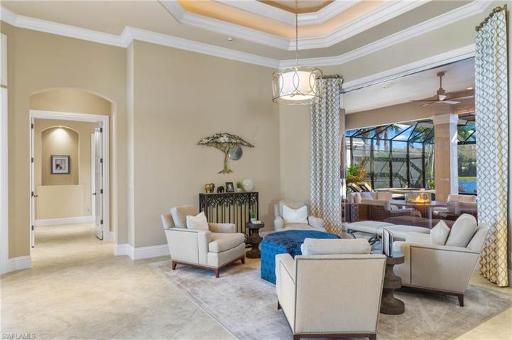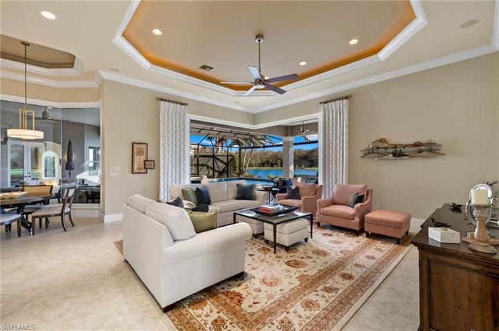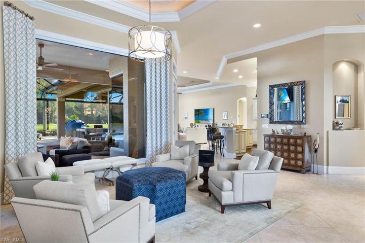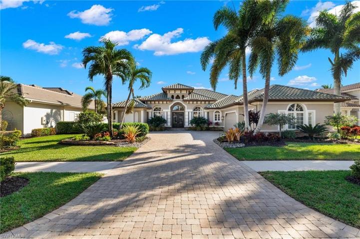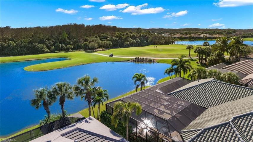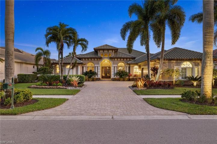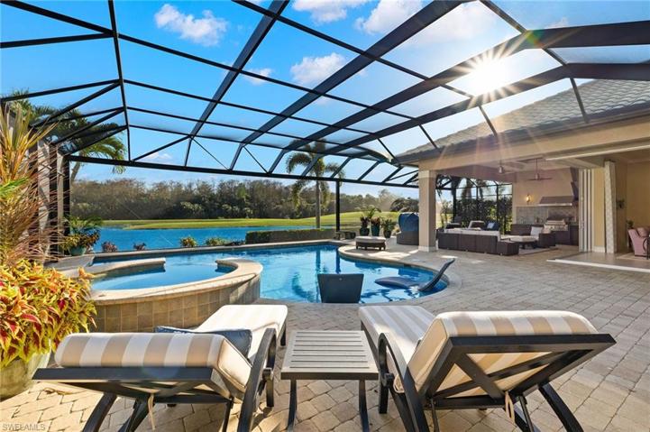 IMMEDIATE GOLF AVAILABLE! Welcome to this exceptional custom-built estate home, boasting over 4,000 sq. ft. of living space. Southern lot with spectacular element of privacy and breathtaking views of the lake, golf course, and preserve. This magnificent residence features an open floor plan complete with 4 bedrooms, a den, and 5 baths. The heart of the home is the gourmet kitchen with professional series appliances, ideal for hosting special gatherings, while the adjoining dining room boasts a full wet bar and butler’s pantry. The expansive private outdoor area is ideal for entertaining complete with a full kitchen, wet bar and two separate seating and dining areas. Take a dip in the sparkling pool or unwind in the soothing spa, creating the perfect ambiance for relaxation and rejuvenation. 500 gallon underground gas tank powers the Spa, range, pool, & fire pit. TwinEagles is one of the finest communities in SWFL, experience 1,115 acres of natural tranquility, 2 Championship Golf Courses- Talon course designed by the Nicklaus Group and The Eagle Course designed by Steve Smyers. New Clubhouse, bocce Courts, Himalayan putting green, Fitness Center, Tennis, resort pool and tiki bar.
