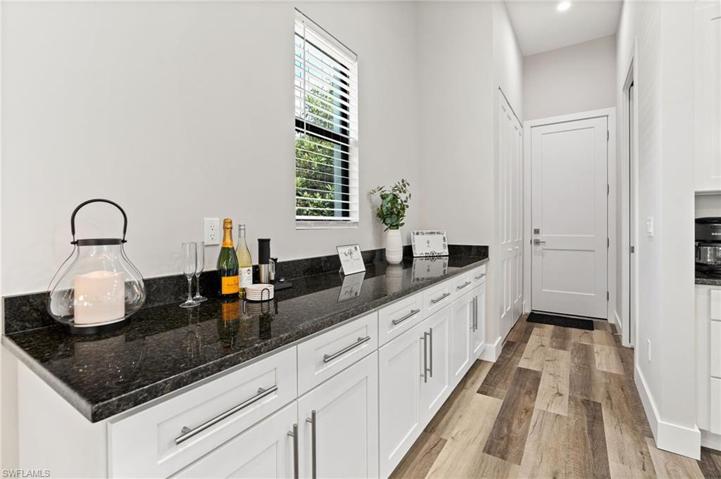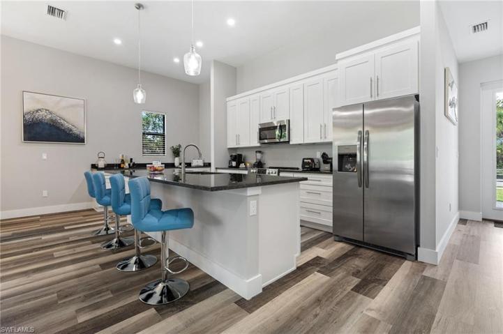Naples, Florida living at its finest! This new construction gem, completed in 2023, offers modern luxury in every detail including 11+ ft ceilings, hand selected solid granite countertops, custom ceiling finishes, high efficiency HVAC system, 8′ single panel doors, 6” baseboard and 4” wood casing throughout, brick pavers pool area, driveway, walkway and entry, hurricane rated windows and doors, the home is also constructed 1′ above FEMA flood requirements. With 3 bedrooms and 2 bathrooms, including a master suite boasting two spacious walk-in closets and a master bathroom featuring a standalone tub and large walk-in shower, this property provides the ultimate in comfort. The kitchen, equipped with stainless steel appliances, is a culinary enthusiast’s dream. Entertain or unwind in your private pool area within the fully fenced yard. Your electric vehicle will be ready to go with the in-garage charging station. At around 1,900 sq. ft., this home exudes contemporary charm and elegance.