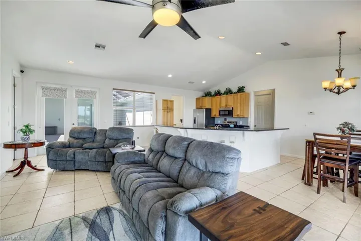 MAJOR PRICE REDUCTION! PRICED TO SELL! Life feels a little easier when the water is always calling — and here, it’s calling from your own backyard. This home sits on a Gulf-access canal where a quick ride brings you straight into open waters, making every day an invitation to explore. Head out at sunrise for a quiet fishing run, cruise to lunch by boat, chase dolphins along the way, or anchor at your favorite sandbar just because the day feels right. Then return home as the sky turns golden and experience our amazing sunsets. Inside, the open concept great room rises with vaulted ceilings and glass sliders stretching across the waterfront side of the home, blurring the line between indoors and out. Morning light floods the spacious kitchen, where a granite island and counter bar invite lingering conversations over coffee or cocktails, and new appliances make cooking feel effortless. There’s a quiet luxury in how the spaces are arranged — the courtyard pool becomes the heart of the home, offering privacy and retreat. A separate en-suite overlooks the pool, creating the perfect haven for guests, older children, in-laws, or a dedicated office that feels tucked away yet connected. In the primary suite, two sets of sliders open to both the canal and the shimmering pool. The spa-like bath offers dual sinks, a walk-in shower, a generous soaking tub, and a private water closet. Out back, life unfolds at water’s edge. An oversized lot, with concrete and wood dockage on a wide canal, provides plenty of room for outdoor living. A 10,000 lb. boat lift sits ready for your next adventure, whether it’s a quiet cruise through mangroves or a day on the Gulf in open blue water. And yet, comfort lives here too — a home that’s beautifully cared for with thoughtful updates: Roof (2022), New Complete AC System (2025), New Dishwasher & Disposal (2025), New Interior & Exterior Paint (2025), New Refrigerator & Range (2024), Washer & Dryer (2020). City utilities are already in place with some assessments paid. Minutes away, the future Seven Islands waterfront development, Coral Oaks Golf Course, and a wide array of shopping and dining promise a lifestyle where convenience meets coastal adventure. This is Southwest Florida living at its best — not just a home, but an invitation to slow down, spread out, entertain freely, and soak up every golden-skied day on the water.