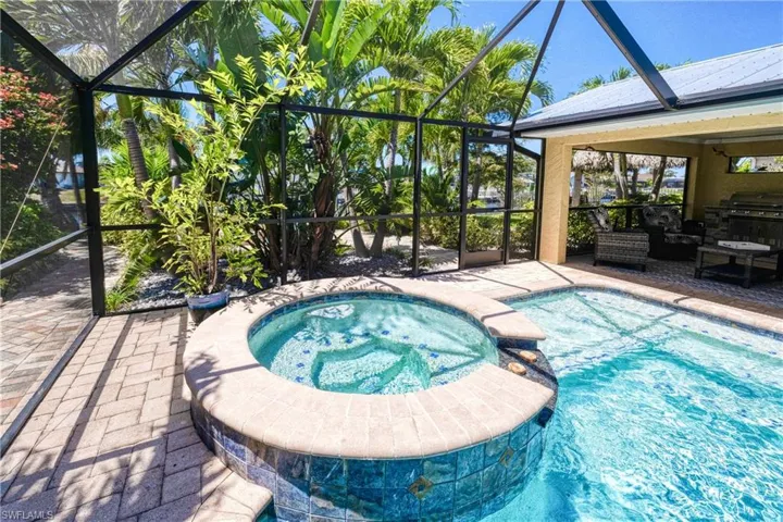 Absolutely Charming 2 Bed, 2 Bath Gulf Access Pool/Spa Home with a Coastal/Key West Vibe – Fully Updated and Move-In Ready! Discover your slice of paradise with this meticulously cared for home. You’ll truly feel like you’re vacationing at a resort. Surrounded by Lush tropical landscaping, a paver driveway, paver walkway, patio, fenced yard and nestled on an extra-deep 145’ lot along the sought-after Rubican Canal. Unwind year round in your heated saltwater pool and spa, relax under the Tiki hut, or entertain in style with an under truss lanai and an outdoor kitchen. If you’re a boater you’re all set. Home is equipped with a Boat dock, 8,000 lb lift, and boat canopy with the lowest bridge clearance of 10′ 9″ to get out to the Gulf. Step inside to a bright, open layout featuring granite countertops, stainless appliances, painted cabinets, beautiful flooring, updated baths, walk-in closet, and so many architectural details that make this home one of a kind. The wind rated metal roof, and hurricane impact windows and doors ensure peace of mind during storm season. NO FLOOD insurance required – high and dry in Zone X and has never flooded. New attic insulation & ductwork (2021) New AC compressor (2021) New water heater (2022). All assessments paid. This is Florida living at its best—laid back coastal luxury, functionality, and waterfront access all in one! Be sure to watch the virtual tour or better yet schedule to see this one in person.