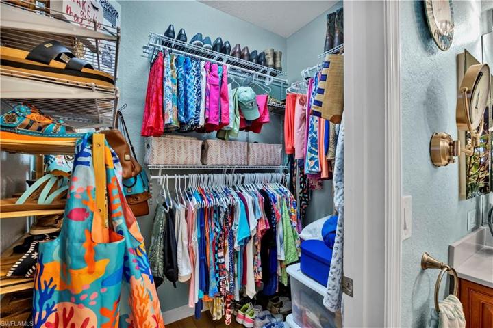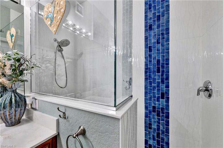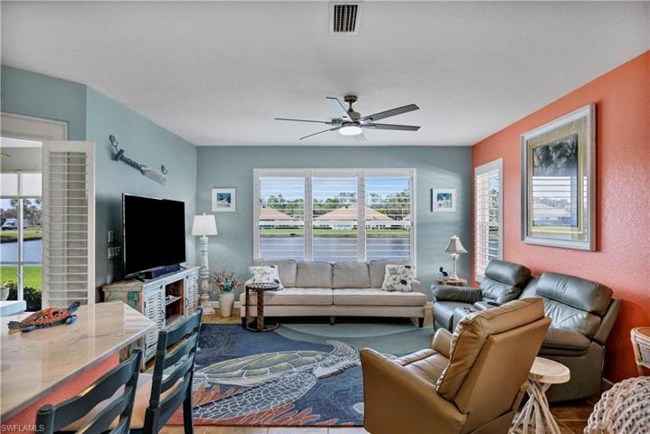 The den, versatile in its function, can easily transform into an additional bedroom with a practical closet addition. The Owner’s Bathroom is a sanctuary of relaxation with a masterfully designed walk-in shower featuring pebble-style tile and tasteful blue accents. Outdoors, the screened-in lanai extends your living space, offering a tranquil lakefront view and privacy with new roll-down blinds. The M&S Complete Home Music System ensures your favorite tunes accompany you even outdoors. A new whole house Kinetico Softwater System was recently added plus a K5 Drinking Water Station.