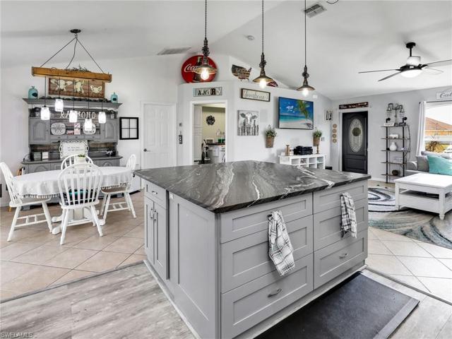 Step inside and discover this beautifully renovated home in the desirable area of NW Cape Coral. The open floor plan is bright and spacious, featuring a stunning kitchen with modern gray cabinetry, a large center island with additional storage, newer stainless steel appliances, quartz countertops, and new flooring. The master bedroom features new waterproof vinyl flooring, a spacious walk-in closet and ensuite bathroom with dual vanities. The additional 3 bedrooms and guest bath are perfect for the family or guests. A highlight of this property is the screened lanai, a perfect retreat to enjoy the Florida sunshine while maintaining your privacy. This residence not only captivates with its interior but also boasts a new roof, ensuring peace of mind. Additional updates include a 2022 well pump and water system, new lanai screens and doors, A/C duct replacement in 2021 with electric temp-controlled attic roof vents, new front door, 2020 hot water tank, and 2018 A/C system. Conveniently situated off Santa Barbara Blvd, you’ll enjoy quick access to an abundance of shopping and dining. Schedule your private showing today!