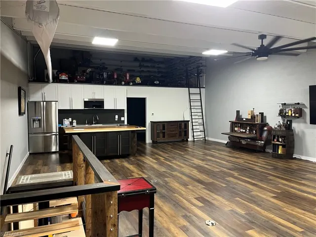 Classic Estates is the premier established community for car enthusiasts in SW Florida. Very rare and sought after facility with only 24 units. This unit was completed as builder model with many upgrades. Fully finished and move in ready, no waiting on lists for 2+ years for your unit. Gated community and security cameras. This unit is 25’x50’, 1250sf on the garage floor, fully finished upstairs loft that is also 1250sf and a bonus loft space on 3rd level that is 400sf. Total finished floor square footage is 2900. 16’x14’ electric roll up door. Water filter system for the whole unit and mop sink on garage floor. The upstairs features a kitchenette with island, full bathroom with washer/dryer laundry area, office/bedroom with walk-in storage/closets and a large hangout/living area with 85” TV. Entire unit is under AC. The garage is equipped with 2 single mast car lifts. A low quarterly fee of $600 covers Internet, Security cameras and gate, Garbage dumpster, Insurance.