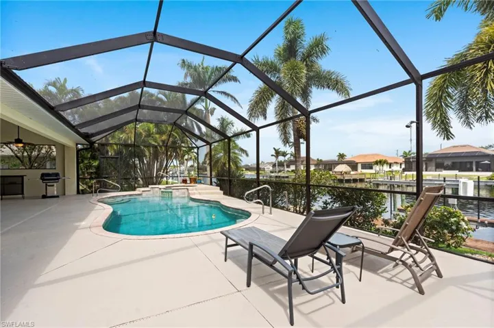 Beautiful Gulf Access Waterfront Home located in the highly desirable area of Southwest Cape Coral. You’ll know you made it to paradise once you open the glass French doors and see the water view and boat dock through the large 90 degree sliding glass doors. This stunning 3-bedroom, 2-bathroom home offers a seamless blend of elegance and functionality, perfect for those who cherish both leisure and luxury. Set against the serene backdrop of Gulf-access canals, this property provides a lifestyle that’s as thrilling as it is relaxing. From the moment you approach, the home’s striking architectural design creates an inviting atmosphere. The soft beige exterior paired with a vibrant terracotta-tiled roof hints at the warmth and comfort that awaits inside. As you step through the grand arched double doors, you’re greeted by an open-concept layout that seamlessly integrates living, dining, and kitchen spaces, all under soaring tray ceilings. The kitchen is a chef’s delight, featuring polished wood cabinets, a walk-in pantry, and top-of-the-line electric appliances including a wall oven and a cooktop. Its design accentuates both style and practicality, with expansive countertops and a breakfast bar that’s perfect for entertaining guests or a casual family meal. Natural light floods the living areas through large sliding glass doors, which also provide panoramic views of the captivating outdoor space. Step outside and you’ll find a screened lanai boasting a heated saltwater pool and integrated spa. Whether you’re lounging poolside with a book or hosting a late-night soirée, this outdoor space is perfectly equipped for all your entertainment needs. The lush landscaping and canal views serve as the perfect backdrop for both relaxation and recreation. The primary suite is your personal retreat, complete with dual vanities, a soaking tub, and a separate shower. Ample storage is ensured with a large walk-in closet. Additional living spaces include a versatile den/study and a welcoming family room. The home is prepared for all your lifestyle needs, featuring a concrete block structure with a tile re-roof and equipped with modern conveniences like central electric A/C and heating, ceiling fans, and prewired cable and internet. The laundry area includes a utility sink.