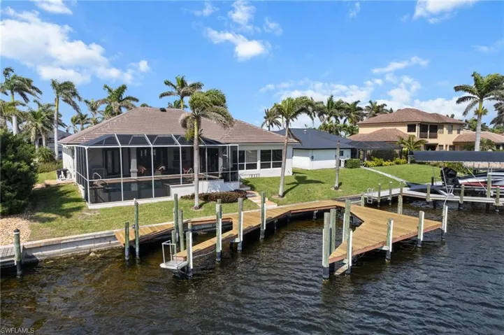 GULF ACCESS-NO BRIDGES! NEW TILE ROOF 2024. Elegant 3 Bed, plus den, 2 Bath, Beautifully Furnished, Canal Home has so much to offer PLUS Breathtaking sunrises over the water. The impressive, circular paver driveway leads you to this exquisite home. The massive double etched entry doors welcome you into the meticulous 2,700 sf, open floor plan w/ vaulted ceilings. A chef’s dream kitchen boasts SS Appliances, granite, custom tile backsplash, amazing island, wine cooler & plenty of storage. Multiple access onto the screened-in, paver lanai to enjoy your outdoor living/entertaining experience. Relax in the gorgeous infinity edge, HEATED POOL & SPA with fountain waterfalls while enjoying the panoramic waterfront views. A boater’s dream w/ direct access to the Gulf of Mexico and minutes away from Cape Harbour’s restaurants, entertainment and nightlife! Coveted, FLORIDA LIFESTYLE awaits you in the peaceful Peninsula Point neighborhood with saltwater access. Flood insurance is transferable $1300 approx. for the year.