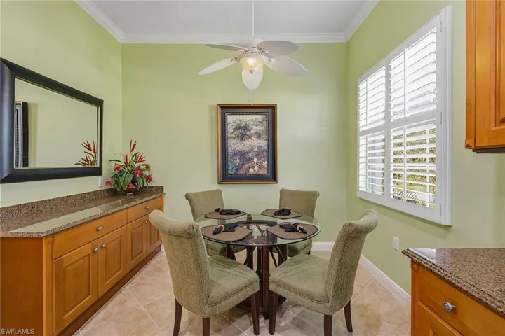 Immediate Marco Club (MCM) golf membership opportunity available for purchase (but optional) with this property, offering rare ability to bypass the waiting list and enjoy immediate access to The Rookery Golf Course, Hammock Bay Golf Course, both private clubhouses, extensive social activities and exclusive beach privileges at the JW Marriott on Marco Island’s award-winning beach. Experience refined coastal living in this beautifully appointed furnished three-bedroom, 3.5-bath second-floor, end-unit residence with an attached two-car garage in Laguna at Fiddler’s Creek, offering elegant design, tranquil lake views, and an exceptional lifestyle opportunity. A dramatic 22-foot foyer with a striking wood staircase welcomes you into the residence, where refined architectural details include crown molding, plantation shutters, and porcelain tile flooring laid on the diagonal throughout the main living areas, creating a bright and sophisticated atmosphere. The desirable great room floor plan provides an inviting flow between living and dining spaces, ideal for everyday living and elegant entertaining. The kitchen is thoughtfully designed with granite counters, a full granite backsplash, premium appliances including a natural gas range, abundant cabinetry and a charming breakfast nook for casual dining, creating a space that is as functional as it is welcoming. The open-concept design extends seamlessly to an expansive screened lanai overlooking a wide, tranquil lake view with desirable northeast exposure, offering a peaceful outdoor retreat ideal for morning coffee, evening cocktails and effortless entertaining while enjoying Southwest Florida’s year-round sunshine. The lanai is enhanced with electric roll-down hurricane shutters and ceiling fans, providing comfort, convenience and storm protection. The primary suite serves as a luxurious private sanctuary, featuring serene lake views, dual walk-in closets and a spacious spa-inspired bath with dual vanities, a soaking tub and a separate glass-enclosed shower. Two additional guest bedrooms provide exceptional comfort and privacy, each with en-suite baths and walk-in closets, while a convenient powder bath serves guests. Additional highlights include newer impact windows and sliding glass doors, a tile roof replaced in 2021, tankless gas water heater, laundry room with cabinetry and utility sink, and a painted garage floor. Residents of Laguna enjoy their private neighborhood pool, along with full access to Fiddler’s Creek’s award-winning clubhouse featuring tennis, pickleball, resort-style pools, state-of-the-art fitness, spa services, exceptional fine and casual dining, and vibrant social calendar. Ideally in Naples, close to Marco Island, Gulf beaches, fine dining and upscale shopping, this exceptional residence offers an ideal blend of luxury, lifestyle and immediate golf access in one of Southwest Florida’s sought-after communities.