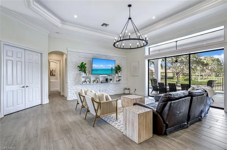 Spanning nearly 3,000 square feet of living space, this thoughtfully designed open-concept floor plan features soaring ceilings, abundant natural light, and exceptional storage throughout. The expansive great room showcases panoramic lake views and flows seamlessly into the kitchen and outdoor living areas, creating an ideal space for entertaining. The split-bedroom layout provides privacy, while two guest bedrooms share a Jack-and-Jill bath. A private den with French doors and a closet offers flexibility as an optional fourth bedroom. The spacious owner’s suite includes dual walk-in closets, an oversized bath, and French doors leading directly to the lanai. Wood-look tile flooring enhances the main living areas, while the kitchen is beautifully appointed with quartz countertops, double islands, a farmhouse sink, and upgraded finishes. Arched and transom windows add architectural character and additional natural light.