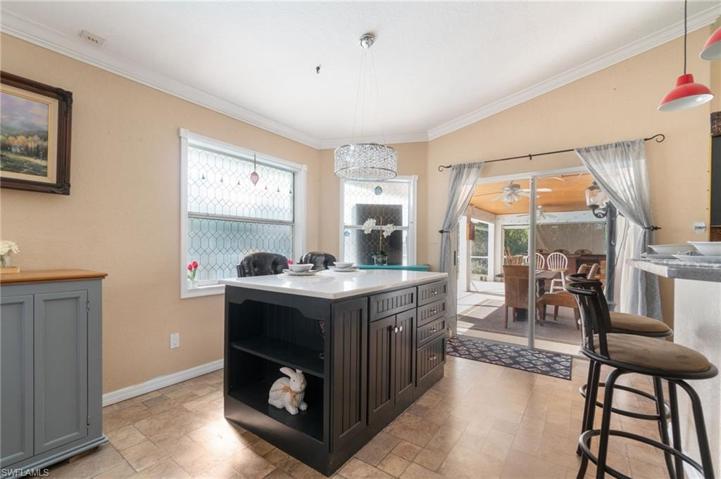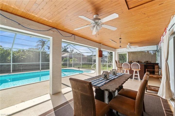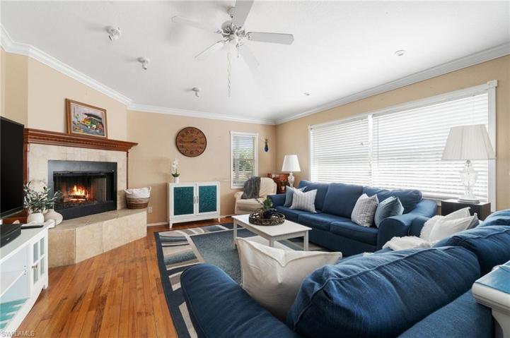 Step into this delightful 3 bedroom, 2 bath home with no HOA fees! New roof in 2018. New Hot Water Heater 2024. This split floor plan design home offers a spacious great room with formal dining, accentuated by high ceilings and hardwood floors throughout the main living areas. The kitchen provides ample counter space and storage, complemented by a breakfast bar that opens to an additional living room featuring a cozy fireplace, ideal for unwinding or hosting gatherings. The outdoor space is truly remarkable, featuring an attached gazebo and a screened-in enclosure around the pool, perfect for enjoying the outdoors. A covered seating area with custom pine ceilings offers a cool retreat from the sun. This home is an entertainer’s dream! Conveniently located near shops, restaurants, and FGCU college. PRICE REDUCED FOR QUICK SALE