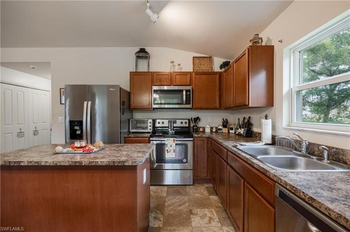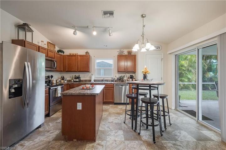 Welcome to this charming 2017-built home in the heart of SW Cape Coral, offering both style and convenience. This well maintained 3 bedroom, 2 bath residence features Whirlpool stainless steel appliances and a split bedroom floor plan, providing ample space for comfortable living. Enjoy city water and sewer with ASSESSMENTS PAID. The gorgeous curb appeal, adorned with lush St. Augustine grass and a variety of palms in both the front and back yard. You’ll love relaxing on the screened-in lanai, (add-on approximately 12′ x 15′) perfect for enjoying the Florida sunshine. With the added convenience of gutters all around and an irrigation system, the exterior is as functional as it is beautiful. The Southern exposure backyard, surrounded by privacy palms, offers a quiet retreat for outdoor activities and gatherings. Located in close proximity to Trafalgar Middle and Elementary Schools, as well as the Cape Coral Sports Complex. This home is a haven for families and those who appreciate a vibrant community. Don’t miss the opportunity to make this property your new home sweet home!