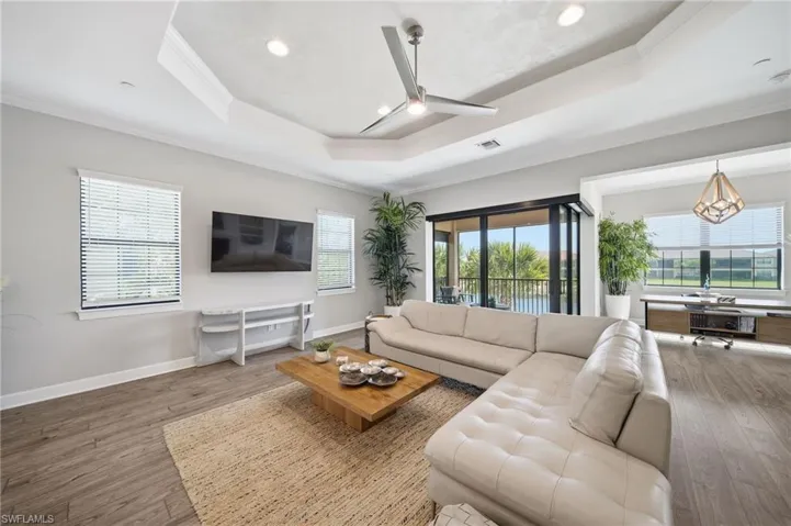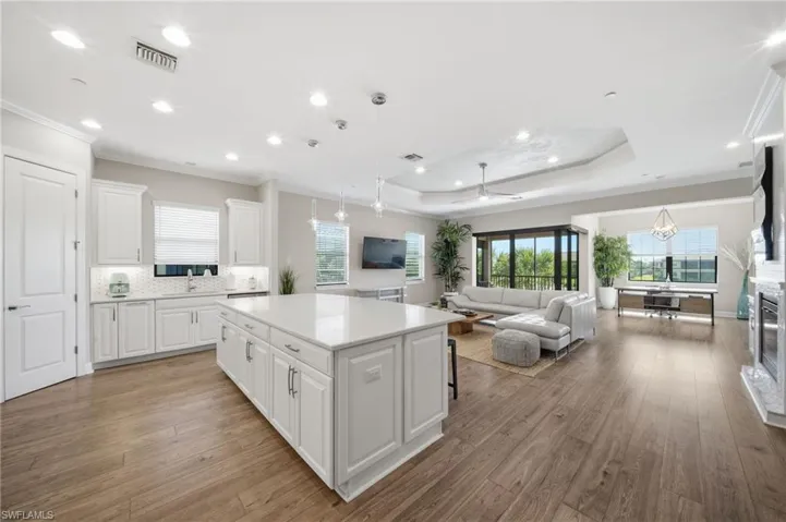 Inside, the open-concept great room is bright and welcoming, enhanced by additional windows that fill the space with natural light—an advantage unique to end units. Wainscoting and beautiful wood-style luxury vinyl flooring run throughout the home, complemented by custom built-in cabinetry and modern shelving that create a warm yet sophisticated ambiance. Crown molding and tray ceilings provide refined architectural detail, while a striking feature wall with tile surrounding the fireplace, shiplap accents above, and custom built-in bookshelves adds character and charm.