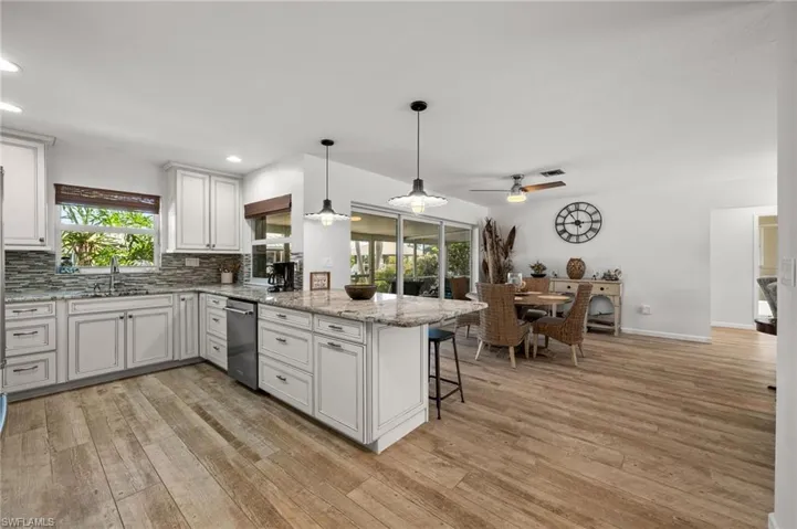 At the heart of the home is a beautifully updated kitchen featuring granite countertops, solid wood cabinetry, a stylish tile backsplash, and stainless steel appliances. The open floor plan connects the kitchen to the spacious living and dining areas, creating a warm and inviting space for everyday living and entertaining. Large sliding glass doors expand the living area outdoors, opening to a generous screened lanai — perfect for relaxing, dining al fresco, or hosting guests. The seamless flow between indoor and outdoor spaces captures the essence of Florida living, with plenty of room to add a pool if desired. The primary suite is a private retreat with a walk-in closet, dual sink vanity, and a beautifully tiled walk-in shower. Guest bedrooms are comfortable and bright, perfect for visitors or a home office. Boaters will love the composite dock, 10,000 lb boat lift, and covered boathouse, offering quick access to open Gulf waters, Famous Fishing grounds of Pine Island Sound and Beaches. Major upgrades include impact-resistant windows and doors (2022) and new septic system (2022). Additional features include wood plank tile floors throughout, a garage workbench, low-maintenance landscaping, and true pride of ownership throughout. This is your opportunity to own a piece of paradise!