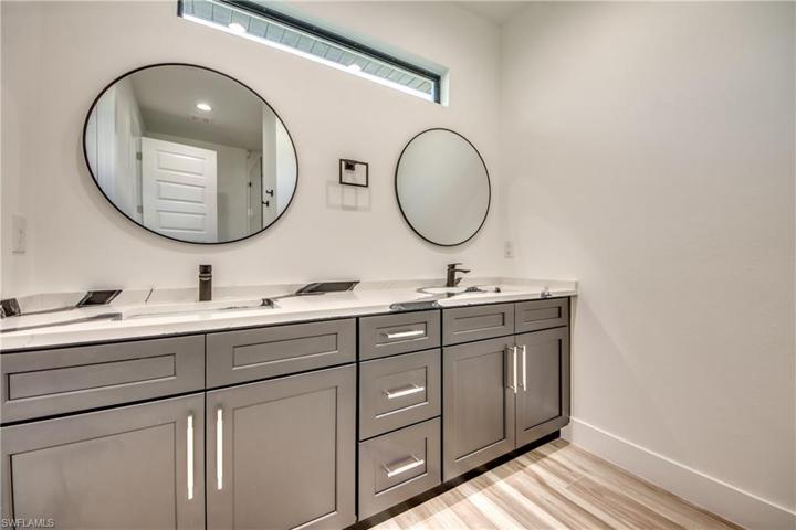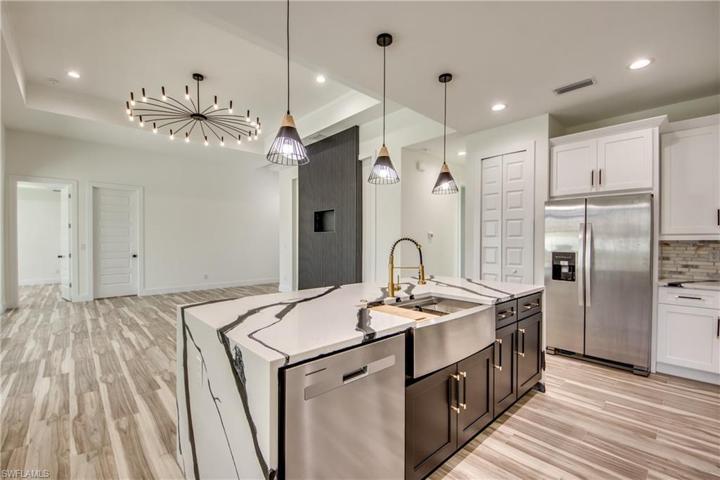 NEW CONSTRUCTION! UPGRADED TO THE HEAVENS AND JUST COMPLETED! No need to find a lot and Get a construction loan! No need to wait 18 months builders are saying for Custom Homes! This one has it all done for you! This 3 Bed, 3 Bath, 2 Car Garage home comes with all the Bells and Whistles. The Kitchen has been decked out with 42″ All Wood Cabinets, Stainless Steel Appliances, Quartz Countertops with Waterfall edge, Tile Backsplash and a huge Kitchen Island. Designer tile throughout – Floors, Bathrooms, Showers – the works! Modern Design Feature Walls in Living Room and Porch, Frameless glass Enclosure in master, Trey ceilings in Living Room and Master Bed and Light and Fan Package! The Exterior doesn’t disappoint either – Good Size Heated Pool with Full Pano Cage, Outdoor kitchen with Pool Bath, Paver pool deck & Driveway, Impact Windows and Best of all its located in the Heart of SW Cape Coral with Assessments in and Paid