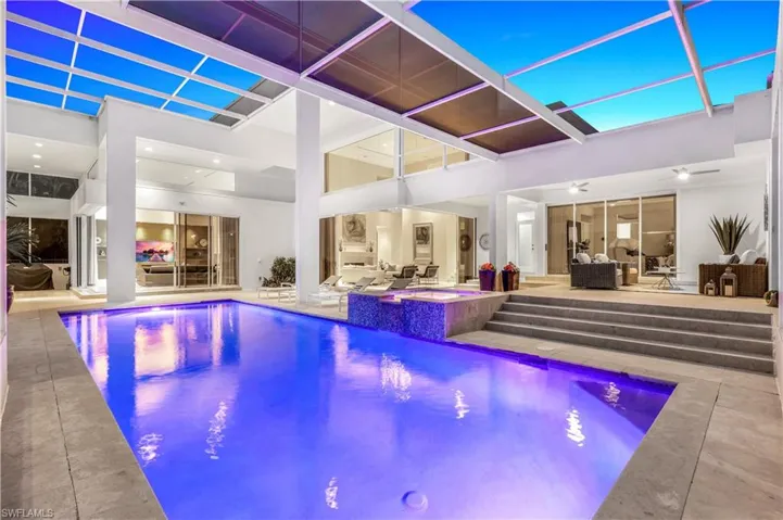 Come experience a stunning modern retreat nestled among spacious grounds that provide sweeping water, golf course and spectacular sunset views all within the highly coveted community of Quail Creek. Interior Features of this 4 bedroom, 5 bathroom plus multiple den / office space home include beautiful Carrara marble and French oak flooring throughout the main areas, living room with wood burning fireplace, wonderful kitchen with oversized 10 foot island, quartz countertops, Miele appliances and both kitchen and baths graced with Imported Porcelanosa cabinetry and tiles. First floor master bedroom suite offers a generous bath with custom closets. Pocket Sliding doors create a seamless and complete indoor and outdoor living experience and spectacular entertaining space. Additional features include a courtyard driveway, Garage with new epoxy floors, Sub Zero fridge, Tesla charger and overhead storage, 1,000-gallon propane tank for pool and spa heat, fenced/turf outdoor space and more! Club membership at Quail Creek is optional, offering residents access to 36 holes of championship golf, a newly renovated clubhouse, an active social calendar, and a host of amenities including spa, pickleball, tennis, bocce and more.