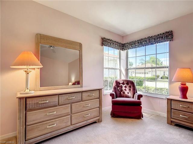 Bright and beautiful Villareal model in HERONS GLEN COUNTRY CLUB just a short walk from the clubhouse, with views of the GOLF COURSE AND LAKE. A tropically landscaped front yard greets you with a stamped concrete driveway, 2020 NEW ROOF, OVERSIZED GARAGE, and screened front LOGGIA. Inside, the spacious living room is centered under a SKYLIGHT, and extends into the AIR CONDITIONED FLORIDA ROOM, surrounded on three sides with windows looking onto the golf course! The kitchen has plenty of space to cook with friends, with upgraded counters and extra cabinetry built in, and the SCREENED LANAI with new cage in 2022 makes the perfect place to enjoy your meal al fresco. There are TWO MASTER SUITES in this model (or a spacious guest suite). The primary master has a gorgeous BATHROOM RENOVATED LAST YEAR with new tile, updated vanity, frameless walk-in shower with seat and niche, plus a WALK-IN CLOSET. The laundry is indoors, and there are HURRICANE SCREENS throughout. All this plus the GOLF CART IS INCLUDED! Drive right up the street to enjoy the pool, restaurant, tennis, or the pickleball, modern fitness center, classes or entertainment. There is always something to enjoy in HERONS GLEN!