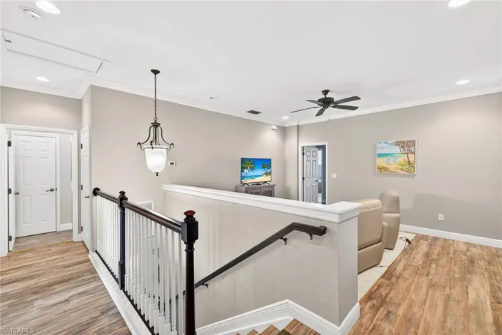 Located in the vibrant Bella Terra community, this spacious 3-bedroom, 2.5-bathroom townhome spans nearly 2,300 square feet and offers the perfect blend of modern comfort and Florida living. Step through the front door of 20468 Larino Loop and immediately experience the bright, airy volume of this expansive townhome. As you move through the foyer, the home opens into an open-concept main level where the living and dining areas flow effortlessly together with tile flooring and crown molding throughout. The well appointed kitchen features a breakfast bar, updated countertops, a custom backsplash, white cabinets and stainless steel appliances. The space also connects with large sliders that lead you out to a screened-in and tiled lanai—the ideal spot to sit back and enjoy the peaceful Estero landscape. As you head upstairs (which has wood flooring from the stairs up), the home continues into a massive, versatile loft area. This space acts as a second heart of the home, offering endless possibilities as a high-end media room, a quiet home office, or a vibrant play zone. Just off the loft, you’ll discover the primary suite— featuring tray ceilings and an oversized walk-in closet. Your primary bathroom features dual sinks with a separate tub and shower. Two additional guest bedrooms and a full bath are positioned to provide maximum privacy for family or visitors. The home comes with manual shutters and also has plantation shutters added throughout. Outside of your homes and inside of the gates of Bella Terra, you have many resort-style amenities to enjoy endlessly. At the center of it all is the 7,000-square-foot clubhouse and a massive lagoon-style pool with a rock waterfall and spa. In addition, there’s the state-of-the-art fitness center, tennis and pickleball courts, beach volleyball, basketball, bocce, a rare in-line skating rink and peaceful walking trails. This community offers a vibrant, all-inclusive environment that perfectly complements the modern comfort of the home.