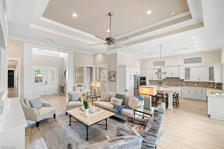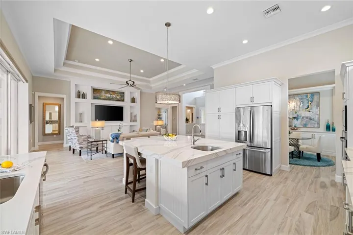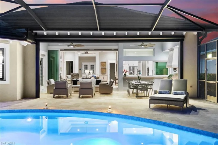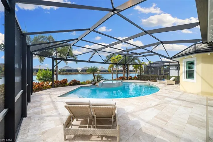 Embrace luxury coastal living in this beautifully appointed move-in ready home in prestigious Isles of Collier Preserve. The Jasmine Grande features an expansive lanai with custom saltwater pool and spa, and marble pavers where you can enjoy a sunny southern exposure and sparkling lake views. The open floor plan seamlessly blends the indoor and outdoor spaces. The kitchen is an entertainer’s dream featuring a large island and sparkling quartz countertops. The oversized primary suite features new wood floors, dual vanities and an oversized walk-in closet. Upgrades include a custom saltwater pool and spa with marble pavers, custom media center and built-in cabinetry throughout, hurricane screen, impact windows and doors, built-in closet systems, motorized sliding door system, overhead garage storage and automatic window shades. The Isles of Collier Preserve amenities include miles of recreational paths, the Overlook Bar and Grill, resort-style pool, fitness center, tennis and pickleball, and a full activity schedule. Just 10 minutes to downtown beaches, shopping and restaurants, this location can’t be beat!