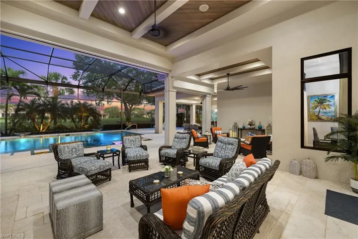SKIP THE WAITLIST! IMMEDIATE GOLF MEMBERSHIP AVAILABLE! Stunning 2016-built estate nestled on a beautifully manicured 0.8-acre lot with unobstructed golf course views in Naples’ coveted Quail West community! Designed with exceptional attention to detail, this home offers 4 bedrooms, a den, 4.5 bathrooms, a 4-car garage, soaring ceilings with custom wood beam accents, and stunning hardwood and tile flooring. Other features include hurricane impact windows and sliders, dual electric hurricane shutters & screens, whole house generator, and a 1000-gallon buried propane tank. An open floor plan and fully pocketing sliders create a seamless indoor-outdoor transition into the resort-style outdoor oasis. Enjoy the custom pool with water features and a tanning shelf, spa, outdoor fireplace, generous lounging areas, and a fully equipped summer kitchen — ideal for entertaining and al fresco dining. A picture window screen enclosure frames the stunning golf course backdrop. Inside, the chef’s kitchen features dual islands, waterfall quartz countertops, elegant dual-toned custom cabinetry (crisp white & rich espresso toned), a walk-in pantry, and top-of-the-line appliances. Adjacent to the kitchen is a glass-enclosed wine room with a wine cooler and built-in storage offering the perfect space for collectors. The luxurious primary suite is a private retreat, offering breathtaking golf course views, direct lanai access, and a spa-like bathroom with dual vanities, an incredible size shower with multiple shower heads, and a freestanding soaking tub for ultimate relaxation. Quail West is a coveted community with two spectacular golf courses, 100,000 sq ft masterfully renovated clubhouse, Racquet Sports complex, indoor lagoon-style Junior Olympic-sized pool, ample dining & social options, state-of-the-art fitness facility with classes available, a full-service salon & spa with sauna & more. Located minutes to Barefoot Beach & nearby Mercato, Waterside Shops & Naples 5th Avenue with easy access to RSW & Naples Airports.