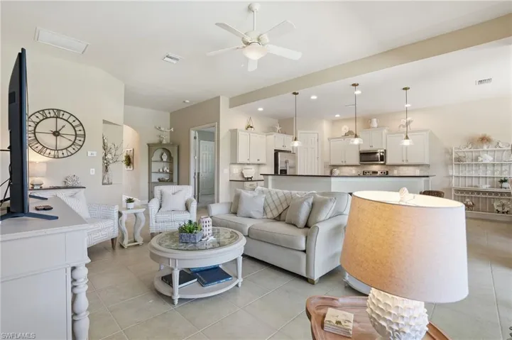 One or more photo(s) has been virtually staged, AI generated or rendered. NORTHEAST EXPOSURE overlooking the POOL, LAKE and GOLF COURSE set the tone for this beautifully maintained residence in Palmira Golf & Country Club, where privacy and tranquil scenery define Southwest Florida living. Inside, nearly 2,000 square feet of single-story living, the floor plan offers 3 BEDROOMS, 2 FULL BATHS, and a 2 CAR GARAGE, blending comfortable everyday living with a relaxed, resort-style feel. Offered TURNKEY FURNISHED, the home includes everything from furniture and décor to linens, dishes, and even a GOLF CART, effortless transition into the resort lifestyle. Outdoor living is where this property truly shines. The expansive lanai features a PANORAMIC SCREEN enclosure that frames peaceful views with no homes in sight. At the center is a LAGOON STYLE SALTWATER POOL enhanced with NEW PHONE CONTROLLED COLOR POOL LIGHTS and HEATER, creating the perfect setting for both daytime relaxation and evening entertaining under the stars. Inside, the main living area is bright and inviting with TILE FLOORING, 11 FOOT CEILINGS, and a BRAND NEW CEILING FAN in the living room and all bedrooms. The open-concept design flows seamlessly into the kitchen, where WHITE CABINETRY with CROWN MOULDING and UNDER CABINET LIGHTING is paired with GRANITE COUNTERTOPS and STAINLESS STEEL WHIRLPOOL APPLIANCES, creating a functional space for both casual meals and hosting guests. The primary suite is a private retreat with DIRECT LANAI ACCESS through sliding doors, PLANTATION SHUTTERS, and a TRAY CEILING that adds architectural detail. The en-suite bath features SPLIT DUAL VANITIES, a SOAKING TUB, GLASS SHOWER, and additional PLANTATION SHUTTERS for both style and privacy. At the front of the residence, the guest bedroom is generously sized with a king bed and PLANTATION SHUTTERS, while the second guest room set behind DOUBLE DOORS, offers flexibility as a den, office, or additional bedroom. The guest bathroom includes a convenient TUB SHOWER COMBINATION. Additional functional upgrades include a dedicated laundry room with UTILITY SINK, UPPER CABINETRY, and a LINEN CLOSET for added storage. The 2 CAR GARAGE is equipped with a MINI SPLIT AC SYSTEM and includes a GARAGE REFRIGERATOR, making it both comfortable and practical year-round. Palmira Golf & Country Club offers an exceptional lifestyle with OPTIONAL GOLF MEMBERSHIPS available. Residents enjoy access to the Renaissance Center Club featuring a RESORT STYLE POOL, LAP POOL, FITNESS CENTER, TENNIS, PICKLEBALL, BOCCE, and a CLUBHOUSE WITH DINING and social events throughout the year. Located just 15–20 MINUTES FROM BONITA BEACH, 5 MINUTES FROM MIDTOWN BONITA, and 10 MINUTES FROM DOWNTOWN BONITA SPRINGS, this residence offers the perfect balance of private golf community living with convenient access to shopping, dining, and Southwest Florida’s world-famous beaches.