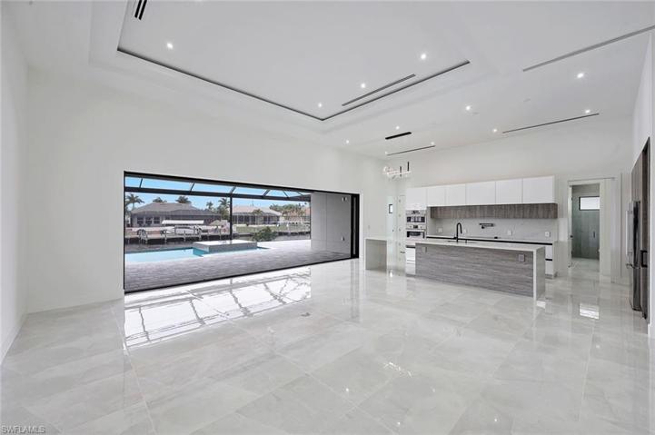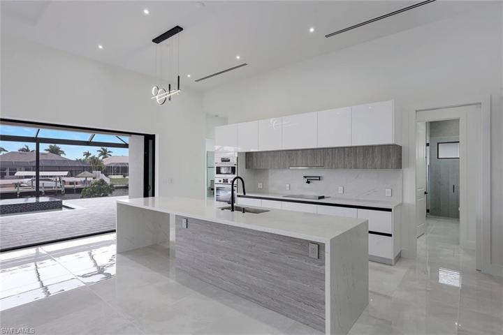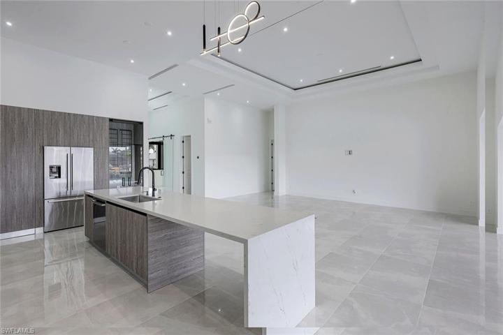Modern New Construction Gulf Access Home in SW Cape Coral. Straight out of the pages of a magazine! Clean contemporary design overlooking a 150+ foot wide canal near Cape Harbour! Featuring 2,844 SF with 4 Beds, Office, 4 Bath, and a 3 Car Garage. Open family room with high volume ceilings and 23′ pocketing sliding glass doors leading out to pool & spa. Entertainer’s Kitchen has European style cabinetry, double waterfall Quartz island, high-end Bosch appliances, hidden walk-in pantry, and wine wall. Master suite overlooks the water. Stunning master bath w/ dual vanities and large walk-in shower w/ designer tub. Junior master suite and 2 spare bedrooms ideal for family & guests. Entertain or Relax on the spacious lanai w/ outdoor kitchen & false-negative edge Heated Pool on the water! Integrated 360 degree spillover spa and sun shelf complete this amazing pool! LOADED WITH FEATURES! Panoramic Screen Enclosure w/ picture window screens, Impact Windows & Doors, Wood ceilings on the lanai & foyer, liner AC vents, designer lighting, and large format tile flooring throughout. Boating & Fishing right from your back yard! Cape Harbour waterfront dining, shopping, and events very close by!