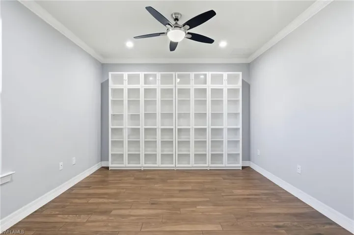 This stunning 3 bedroom plus den, 3 bathroom home is in excellent condition and ready for you to move right in. Recent upgrades include a brand-NEW refrigerator (2025), NEW hypoallergenic carpet (2025), and a NEW water heater (2024). As you enter, you’ll be greeted by beautiful corner sliders that fully pocket away, creating a seamless transition between the living room and the spacious lanai. Elegant details such as a leaded glass front door, crown molding, 8-foot doors, built-in office cabinets, and framed bathroom mirrors add sophistication throughout. The large kitchen features an oversized island, electric cooktop, wall oven, and lower cabinets with pull-out drawers, making it easy to access cookware while staying connected with family and guests. Overlooking the open living and dining areas, the kitchen is the perfect hub for entertaining. Just off the living room, the screened lanai offers a sparkling pool and tranquil water view, with plenty of covered and uncovered seating to enjoy breathtaking west-facing sunsets. Situated on a corner lot, the home provides extra space and added privacy with no neighbors on one side.