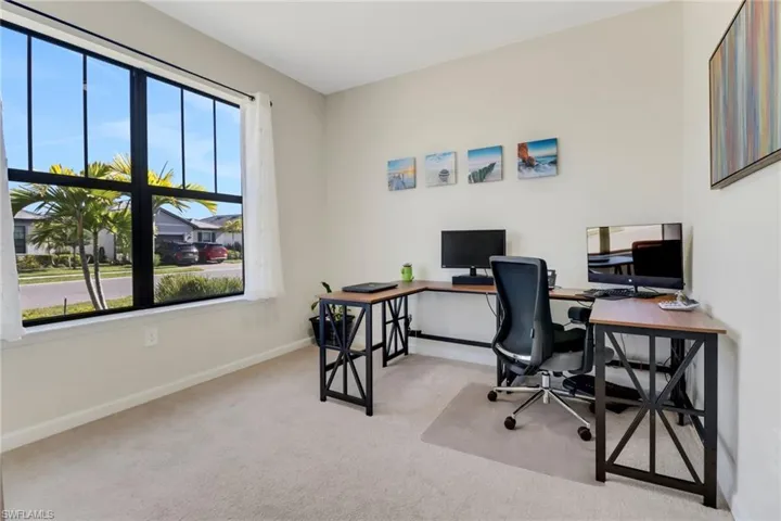 situated at the front of the home, along with the second full bathroom. Upgrades in this home include a wrought iron fence and gutters. The home also comes with a whole-house WiFi connection and modem. The Hampton Lakes HOA provides a gated entry with virtual security, ground maintenance, irrigation water, and bundled basic digital cable and internet. The community’s Town Hall Center amenities are simply outstanding,