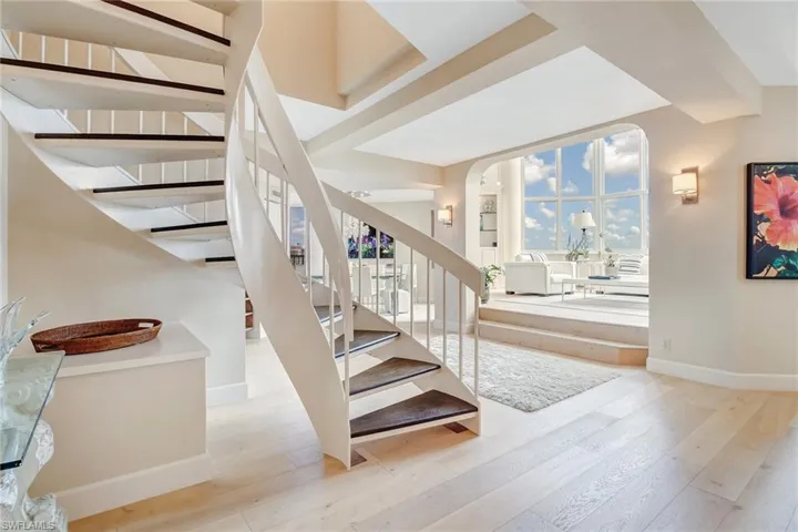 This rare two-level residence at the top of The Savoy Condominium offers 2 bedrooms, 2.5 bathrooms, and breathtaking panoramic views of the Gulf, the bay, and the city skyline from nearly every room.