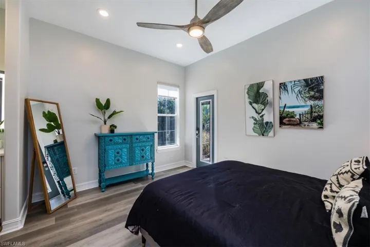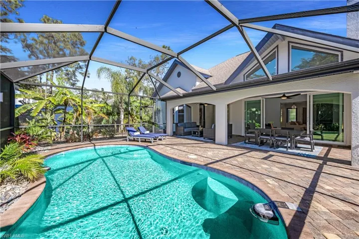 The outdoor living space is a true paradise, designed for relaxation, entertainment, and embracing Southwest Florida’s natural beauty. A screened lanai with a pool and a stunning paver deck sets the stage for tranquil afternoons or lively gatherings. This private retreat is adorned with mature coconut palms, mulberry and banana trees, and even a fire-pit for evenings under the stars.