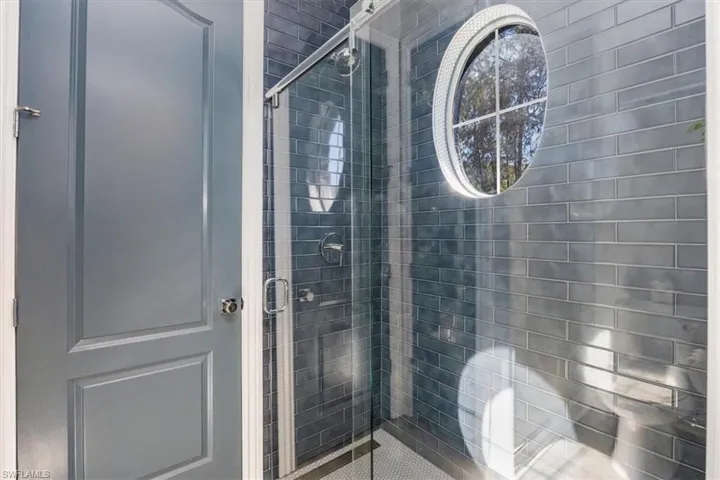 The chef’s kitchen is nothing short of spectacular, designed to impress even the most discerning culinary enthusiast. Quartz countertops, stunning navy and white custom cabinetry, an elegant subway tile backsplash, and stainless steel & modern appliances are complemented by a dramatic patterned tile feature wall. Open shelving and a breakfast bar add both function and flair. Perfect for entertaining, the custom wet bar is a showstopper with its sleek quartz countertops, rich dark cabinetry, a vibrant emerald patterned backsplash, and a built-in wine refrigerator. The adjoining living spaces flow seamlessly, enhanced by soaring ceilings, abundant natural light, and thoughtful accents, and oversized transom windows that perfectly frame views of the lush outdoor retreat.