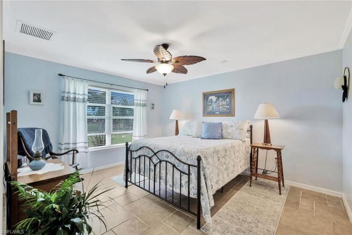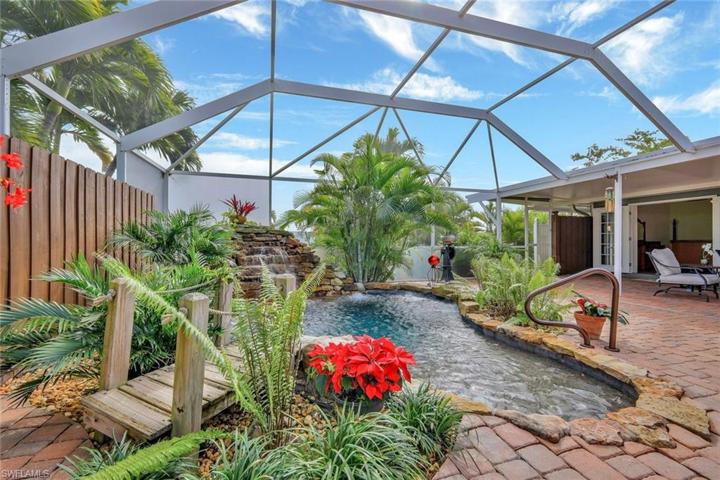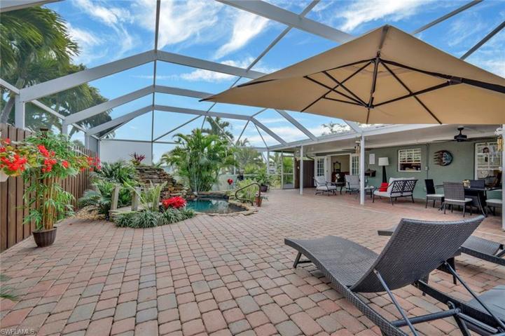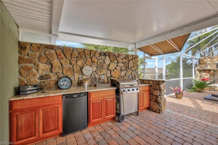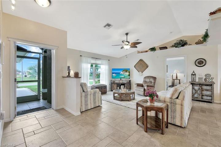Welcome to this modern and casual 3-bedroom, 2-bathroom home located in NE Cape Coral. Step inside to discover a home with no carpeting, all tile floors, and a cozy ambiance. The backyard is a true oasis, featuring a gigantic, screened-in lanai with a spool (a small pool or oversized hot tub) that boasts a huge waterfall, creating a delightful ambience with its soothing sound. The spool is efficiently heated and equipped with a saltwater chlorination system, making it gentle on the skin and hair. Additionally, the pool offers color-changing LED lighting and a hidden button that, when activated, creates bubbling hot tub-like effects. NEW spool pump with warranty, NEW pressure tank, & NEW auto-fill float. The large deck is perfect for outdoor entertaining, offering a grill, outdoor kitchen area, and a gas fireplace with integrated lighting, creating a warm and inviting atmosphere even when not lit. The backyard also includes an additional park like seating area and is adorned with palm trees featuring nightscape lighting. Inside, the home features a primary bedroom and spare bedroom that overlook the stunning pool area, while a third bedroom is utilized as an office.