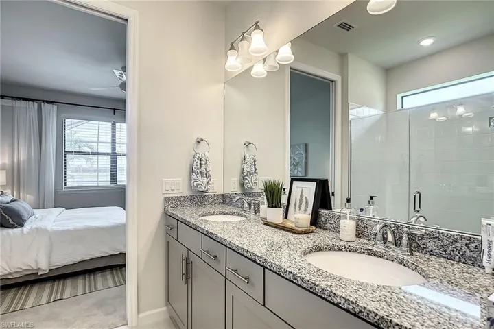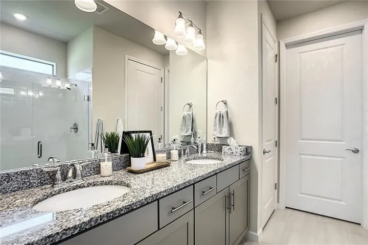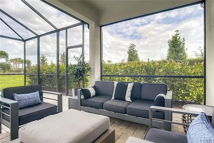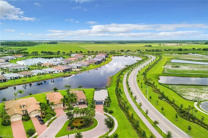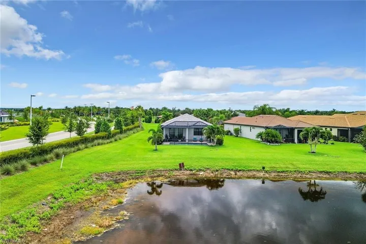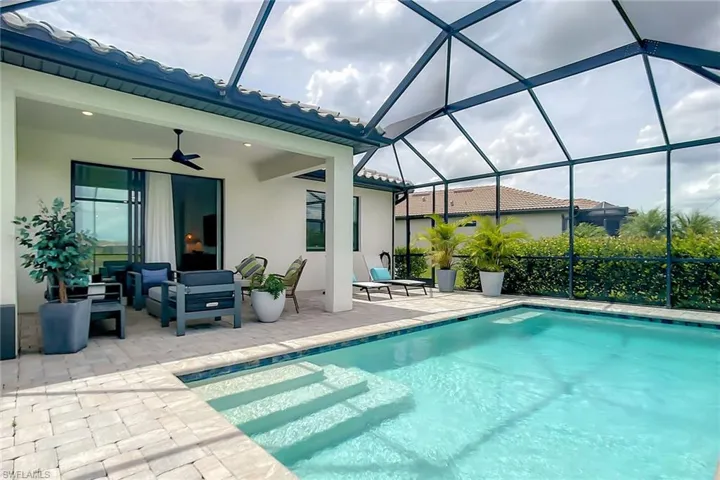 POOL HOME – Shows like a model home! Upgraded with your own private pool on a premium oversized 9,652sqft lot at the end of a quiet & peaceful cul de sac. This tranquil single story, 2/2 home plus den, opens up to just under 900 sqft of very private caged lanai/decking and pool area with views over a beautiful lake which attracts interesting birds/wildlife. Located on the prestigious Del Webb Naples 55+ Golf Community in the up and coming Ave Maria area. The property, though self-contained with its own amenities, is within walking distance of the Oasis Clubhouse, included in your HOA, with facilities such as the community itself and Ave Maria. The present owners spent nearly 100k on upgrades from base model specs, including the premium oversized lot, lake, view, private pool & cage, stainless steel KitchenAid appliances, counter depth fridge, slide in range, 42″ cabinets, subway tile splash backs, upgraded floor tiling! Open plan kitchen with center island flows through to the lounge area, 3 sliding black framed glass doors, framing the wonderful lake views. Further upgrades include comfort level granite counter tops in kitchen, bathrooms, 8ft doors, frameless glass shower door in master. The community boasts an optional 18 hole golf course, 2 clubhouses & a state of the art fitness center.