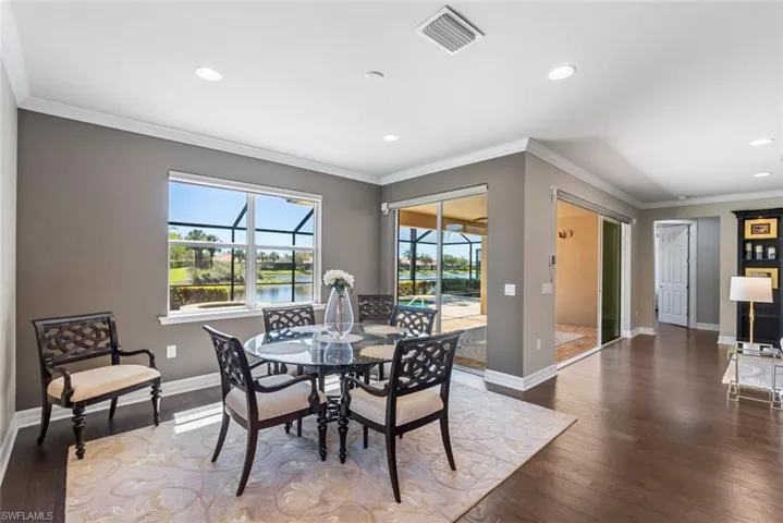 PREMIUM GOLF COURSE VIEW and GOLF MEMBERSHIP INCLUDED!! This amazing home is located in Del Webb situated on the serene water and 10th green of the Panther Run Golf Course! This house is located in the highly sought-after 55+ Del Webb Naples community, featuring the popular Dunwoody floor plan with 3-bedroom + den and numerous upgrades. The GOURMET KITCHEN will be a chef’s dream and perfect for entertaining with the large island, upgraded appliances and beverage center. Automated custom window coverings accent the Family Room along with beautiful wood cabinetry and shelving. A versatile den provides ample space for visitors, a home office, or personal hobbies. The extended lanai is a true paradise, featuring a screened-in SALTWATER POOL and SPA, perfect for relaxing or entertaining guests and the SUNSETS are absolutely breathtaking. The PENTAIR control panel has been upgraded. The luxurious PRIMARY SUITE offers private access to lanai, a large custom walk-in closet, an en-suite bathroom with dual sinks, shower and soaking tub, creating a personal sanctuary. The 4′ extended – three car garage has ample space for a golf cart, hobby area and storage. You will have a peace of mind knowing that the Water Heater and Pool Pump were installed in 2024. A new HVAC system was installed in 2022 and the exterior was freshly painted in 2025. Golf enthusiasts will be thrilled to know that this home includes the MEMBERSHIP to the Panther Run Golf Club, offering an exceptional golfing experience.