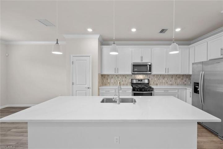 Welcome to this exceptional five-bedroom three-bath home in charming Manatee Cove. This new home features an open floor plan with luxury vinyl flooring in the living areas, volume ceilings and exceptional natural light. The kitchen is nicely equipped with stainless Whirlpool appliances, a large center island with quartz countertops and upgraded cabinets. Custom tile backsplash adds an elegant touch. Additional space on the main floor makes a wonderful den and office or fifth bedroom and includes a full bath. At the top of the stairs is a spacious primary bedroom with a walk-in closet, and an en-suite bath with dual sinks and a large shower. The high ceilings in the upstairs family room allow for individual space and privacy for family and overnight guests. Design your own pool and enjoy a spacious retreat in the large backyard. The screen-enclosed, covered lanai opens to an exceptionally large yard. Conveniently located to Marco Island, Old Naples 5th Avenue and the beaches. Amenities include a resort-style pool, a cabana area and a beautiful fire pit.