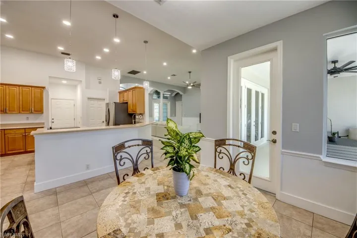 The heart of the home is its open-concept living space, where the living room, dining room, and kitchen flow seamlessly together, all overlooking the water—perfect for entertaining or simply enjoying the view. The spacious kitchen is designed for both function and entertaining, offering ample cabinetry, a center island, pantry storage, and pendant lighting that adds warmth and style. A bright breakfast area just off the kitchen overlooks the water, creating the perfect setting for morning coffee or casual dining with a view. Each room is equipped with its own European mini-split AC, providing individualized comfort and energy-efficient cooling, perfect for year-round living in Southwest Florida. Recent updates include fresh interior and exterior paint, a new slate roof (2024), new baseboards, updated lighting and fixtures, and a heated pool, all enhancing the home’s modern comfort and functionality. Inside, high ceilings and elegant tray ceilings in the dining room and primary suite create an open, airy, and sophisticated atmosphere. Designed for both privacy and flow, the open-concept layout with split bedrooms balances entertaining and everyday living. The overall style is elegant yet casual, making it as versatile as it is inviting.