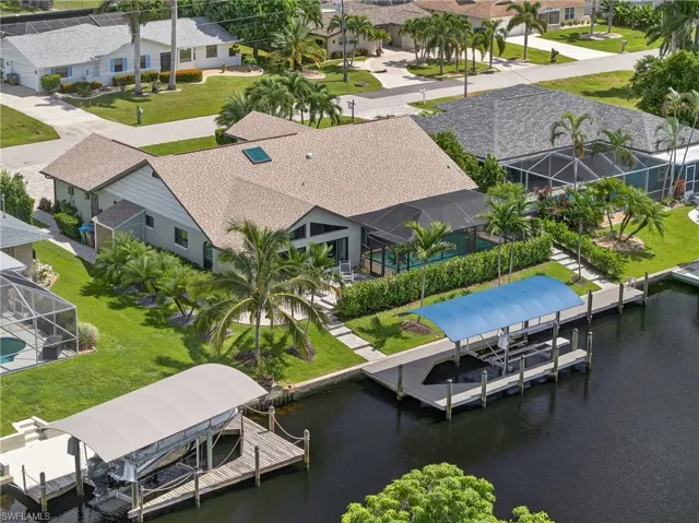 ONE-OF-A-KIND IN CAPE CORAL! SIMPLY STUNNING 3 BEDROOM, 3 BATH, 2-CAR GARAGE WATERFRONT POOL HOME WITH QUICK ACCESS TO THE CALOOSAHATCHEE RIVER LEADING TO THE GULF! NO FLOOD DAMAGE OR FLOOD CLAIM FROM HURRICANE IAN. 80’ of waterfrontage with 60’ Trek dock, water, electric and 7,500 lb. boat lift for the avid boater. Professionally decorated with high end accents and rich architectural details captured in every room of this amazing home! Beautiful iron doors lead inside to an open floor plan featuring high ceilings, contemporary décor, modern lighting, imported Italian tile floors, separate office with glass door entrance and light and bright living and dining space exuding coastal luxury. Gourmet chef’s kitchen offers leathered quartz counters, custom cabinetry, stainless appliances, breakfast bar and barn doors leading to separate coffee bar. Designer primary suite is a haven for relaxation featuring access to lanai and luxurious en-suite. Split floor plan gives plenty of privacy for guests featuring inviting bedrooms and separate updated guest bath with custom tiled walk-in shower. Large inside utility room features high end washer and dryer and extra space for storage. Step outside to an exceptional entertaining area featuring covered lanai with custom ceiling and accents making this a comfortable space for entertaining, nighttime exterior lighting, convenient pool bath and screened heated 14’x28′ 17,000 gallon pool overlooking outside patio and paver walkway to dock. Northwest exposure to enjoy gorgeous sunsets. Hurricane impact windows, iron front door, StormSmart screens and new roof in 2022 provide ultimate peace of mind. New lush landscaping, extended paver driveway and walkways plus soffit and exterior lighting add to the enhanced curb appeal. Not one detail has been overlooked in this truly impressive home. Great location minutes from Tarpon Point Marina and downtown Cape Coral with fine dining and shopping, fishing, boating plus close to great schools and a short drive to Fort Myers and gulf coast beaches. This home is truly a masterpiece! Don’t miss this opportunity! Schedule your private showing today! See attached for extensive list of seller upgrades and features.