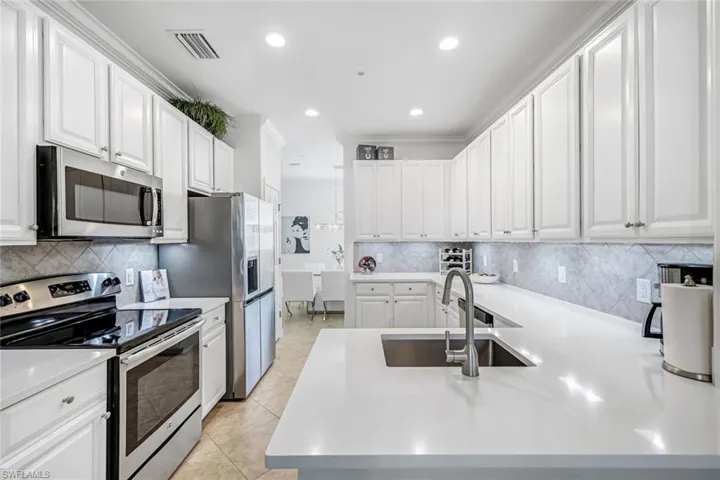 Fantastic New Price Improvement and Offered TURNKEY (with a few exclusions)- Upon arrival you’ll enter a lovely gated cove to the front door offering a private entry. From there you Step into a stunning and tastefully decorated home. In a few steps, you will immediately feel the freshly painted rooms, New Carpet, Eye catching Lighting, a nice Open Plan and peaceful beauty out to a spacious cozy lanai. The Gourmet Kitchen is Current Stylish with 42 inch white cabinetry, beautiful new Quartz Counter Tops, Stainless Steel GE appliances and a gorgeous 4 door LG Refrigerator. You have both a formal dining room and a breakfast nook, each right off the kitchen, both light and bright. Every room is bright and spacious with plenty of room for how you love to live. The floor plan is split with separate guest bedrooms in front and the the Master located to the rear of the home for peace and comfortable privacy. Ladies! Wait until you see the closet space in this home! Bedrooms Carpet has been replaced since photos..The home also sports tile flooring on the diagonal through out and the lanai, crown moulding and upgraded blinds on all your IMPACT GLASS Windows. This Hideaway Cove Beauty has great features such as a newer AC in 2023, Oversized 2+ Car garage capable of housing two cars plus a golf cart ,work shop or whatever you desire.