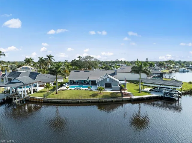 Waterfront dream home, perfectly nestled at the end of a private peninsula on the Caloosahatchee River, offering direct Gulf access. This three-bedroom, two-bath gem is a boater’s paradise, featuring a boat house, a 40,000-pound boat lift, and a dual jet ski lift for seamless adventures on the water. Step inside and be greeted by an inviting foyer that leads to a sunken living room, where expansive western-facing windows showcase breathtaking sunsets over the river. The open-concept kitchen is a chef’s delight, complete with a spacious quartz island, custom cabinetry, and seamless flow into the family room, which features a cozy fireplace and river views. The split-bedroom floor plan ensures privacy, with the luxurious master suite with custom wood details offering direct river views, sliding door access to the pool area, and a spa-like ensuite bathroom with dual vanities, a large walk-in shower, and a generous walk-in closet. The rear guest bedroom also boasts pool access and a private slider leading to the boat house. Outside, your personal oasis awaits. Relax on the covered patio, lounge by the pool, or unwind in the hot tub—all while taking in the serene beauty of the riverfront setting. With panoramic water views and luxurious amenities, this home effortlessly blends elegance with tranquility. For added peice of mind, flood panels have been installed to protect from water intrusion! Don’t miss the opportunity to own this extraordinary riverfront retreat—perfect for those seeking the ultimate Florida lifestyle!