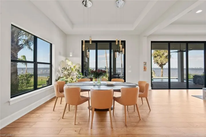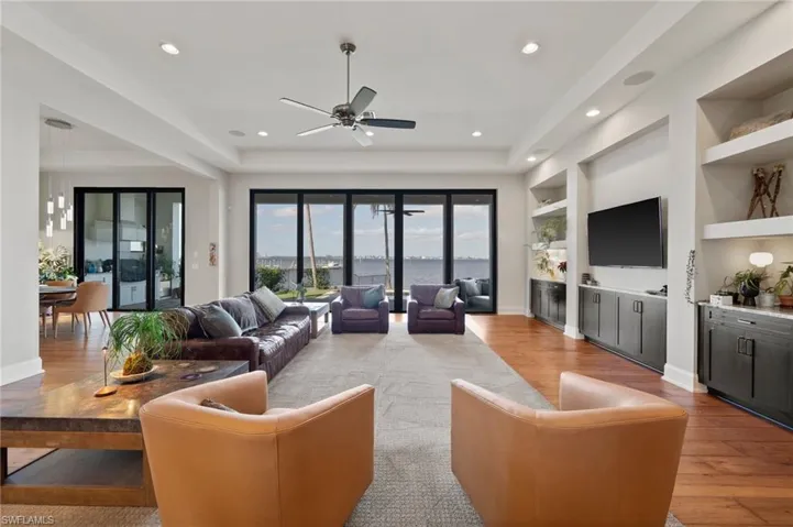 LUXURY RIVERFRONT LIVING. Custom Carlton-Naumann 6,394 Sq. ft. masterpiece, where a rare opportunity with unobstructed water views awaits you. Expansive pool and new 320-foot dock, Boat lift and space to fit multiple boats, perfectly positioned on an oversized .39 acre lot, directly on the CALOOSAHATCHEE RIVER. 6 Bedrooms, Den, Study and 6 Bathrooms & pool access. Furniture is negotiable. Living room couch, chairs, throw rug and dining room set are brand new. Every inch custom designed to showcase panoramic water views and sophisticated coastal elegance. Step inside to soaring ceilings and seamless indoor-outdoor living spaces that frame the stunning River backdrop. Open-concept great room flows effortlessly into a Quartz & Granite kitchen, featuring top-of-the-line appliances, custom cabinetry and a grand island ideal for entertaining. Underground propane tank services kitchen cooktop, Pool heat, outdoor kitchen and Fireplace. Equipped for whole house generator. Impact glass throughout. Retreat to a lavish suite, featuring a private terrace overlooking the river, spa-inspired bath and grand walk-in closet. Multiple guest suites offer privacy and comfort for family, friends and guests. Outside you will enjoy the ultimate Southwest Florida lifestyle with a resort-style pool, expansive covered lanai, outdoor kitchen and private dock, perfect for boating, fishing, water sports and sunset cruises. Located just minutes from fine dining, shopping and beaches, this gorgeous property blends tranquility with convenience. From sunrise to sunset and evenings by the pool, this is more than a Home. It is Paradise…on the RIVER.