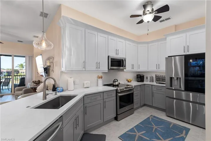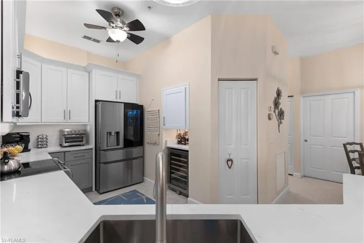 The fully RENOVATED kitchen showcases elegant quartz countertops, NEW cabinetry, a built-in wine cooler, and NEW LG appliances, including a NEW LG washer and dryer. A tankless water heater adds modern efficiency. The living areas, both bedrooms, and the den are enhanced with Nucore waterproof vinyl flooring with cork backing, along with new base molding, offering both style and durability.