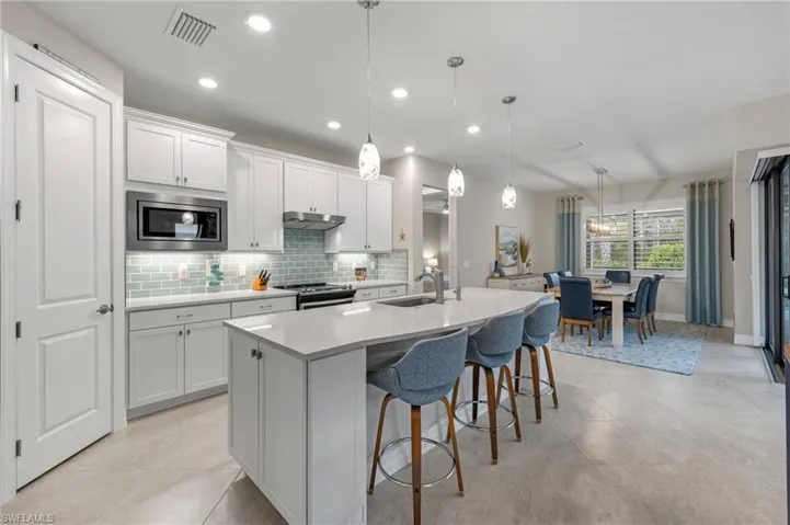 If you have been hoping for a spectacular 3 BEDROOM / 3 BATHROOM PLUS DEN SUMMERWOOD POOL HOME, wait no longer. This floor plan is RARELY AVAILABLE, so make your appointment to see it today! You will appreciate the quality upgrades from the moment you step through the glass front door. Tile on the diagonal, 8 ft. doors, volume ceilings and glass French Doors to the Den are just a few. The Kitchen showcases beautiful quartz countertops, custom tile backsplash, stainless steel appiances, a large island and oversize pantry. The Primary Bedroom is spacious with an ensuite Bathroom and ample walk-in closet. A 2nd Bedroom offers a Murphy bed and ensuite Bathroom perfect for an office or guests. A 3rd Bedroom and Bathroom complete this house. You can relax and enjoy the SOLAR HEATED saltwater pool with spa from the extended lanai. For your practical side, you will appeciate the WHOLE HOUSE GENERATOR, hurricane screens, accordion shutters, whole house water filtration system, water softener, extended garage with overhead storage and epoxy floor. Bridgetown amenities include a resort style pool, chilled lap pool, state-of-the-art fitness center, bocce, pickleball, tennis, a BBQ/picnic area with firepit and a play area. Don’t delay – make an appointment to see this amazing home today!