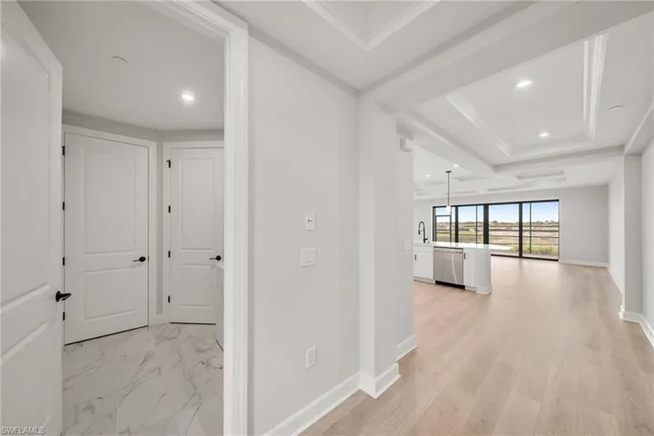 Beautiful and bright first-floor unit located in the highly desirable Esplanade at Hacienda Lakes community in Naples. This residence features numerous upgrades throughout, offering a refined and modern living experience. The open-concept layout is enhanced by high ceilings and abundant natural light, creating a spacious and inviting atmosphere.