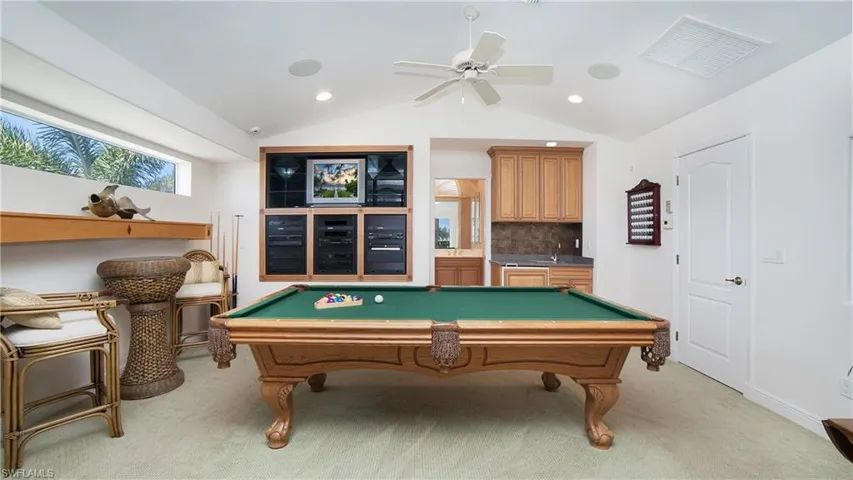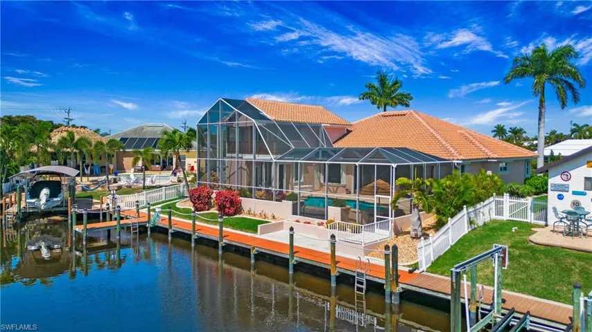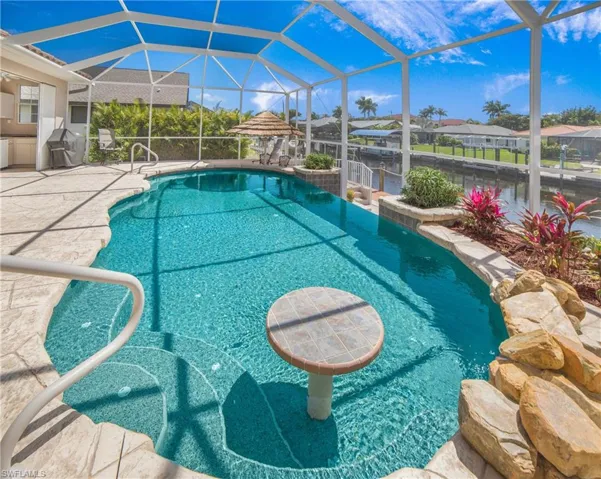 Experience luxury waterfront living with this impressive 4-bedroom, 4-bathroom, 2-story canal front home located in the heart of Cape Coral! Boasting direct Gulf access and nestled on a tranquil canal, this residence offers a peaceful retreat in a prime location. The oversized 2-car garage features epoxy floors, a door to the backyard, and plenty of overhead storage. Step inside to discover vaulted ceilings that create an airy and spacious atmosphere, complemented by an elegant gas fireplace and built-in features that add charm and functionality to the living spaces. The kitchen is the heart of the home and showcases maple cabinetry, corian countertops, an expansive central island, and butler’s pantry. The screened-in lanai invites relaxation and outdoor enjoyment, featuring a stamped concrete patio, outdoor kitchen with sink, mini fridge, and jenn air electric grill, all overlooking the canal—a perfect setting for entertaining guests or simply unwinding in paradise. Also on the lanai is a jacuzzi with rock waterfall and small river with swim up bar top. The pool is self cleaning, auto leveling for water, with changing light colors. The open floor plan seamlessly connects the living areas, kitchen, and dining spaces, making it ideal for modern living and gatherings. Upstairs you will find a game room with a pool table, entertainment center, TV, and top of the line sound system. Exquisite details are found throughout this home, including 17″ tile flooring throughout, pocket slider doors onto the lanai and upstairs balcony, surround sound system, and main bedroom doorway sensors that automatically turn on lights as you walk through. This waterfront oasis provides not only a luxurious lifestyle but also the convenience of boating access to the Gulf of Mexico. Imagine starting your day with a sunrise cruise or ending it with a sunset sail—all from your private finger dock, extending 15 ft for mooring boats, complete with boat davit and Tiki hut. The seawall was built in 2018, providing peace of mind for years to come. Don’t miss the opportunity to own this stunning canal front home in Cape Coral, where every day brings the beauty of waterfront living to your doorstep!