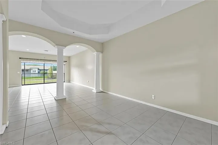 With over 2,800 square feet of open-concept living, the layout offers impressive scale and flexibility throughout. Nearly 10-foot ceilings, architectural arches, and columns create an airy, elegant feel, while the expansive screened-in lanai captures peaceful lake views, western exposure, and glowing sunsets. Storm Smart sun-blocking shades allow for comfortable year-round indoor-outdoor living.