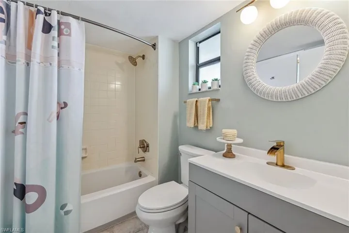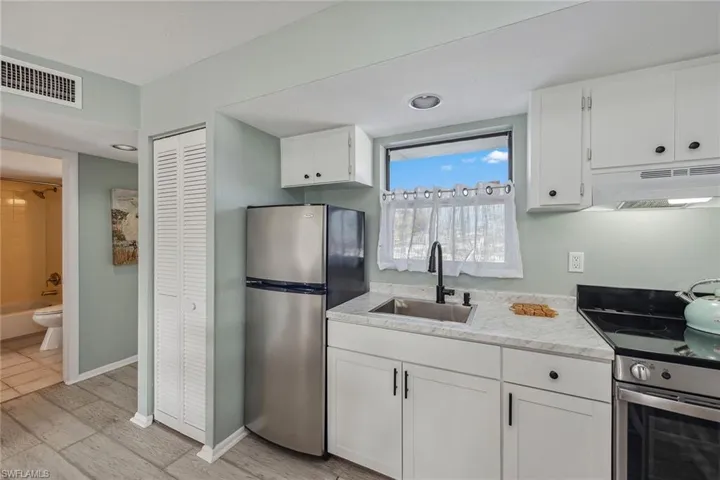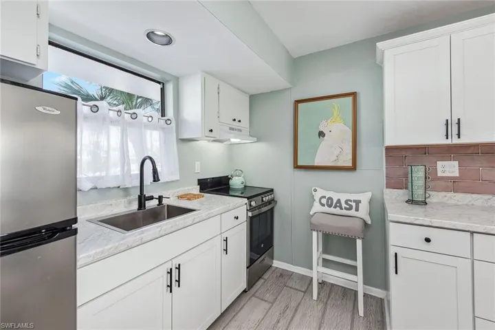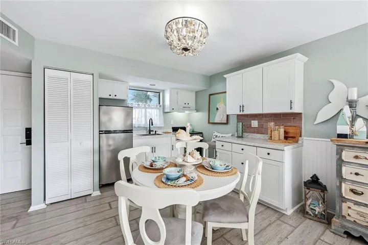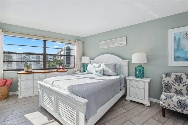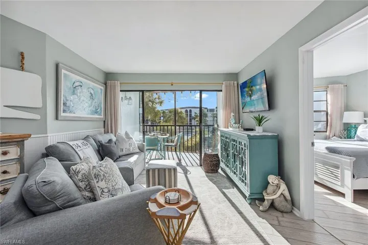 Live the ultimate tropical lifestyle in this beautifully updated and spacious one-bedroom, one-full bath condominium on the third floor of Building A in the sought-after Anglers Cove community on Marco Island. With desirable southern exposure and captivating views of the river, swimming pool, tennis courts and lively tiki hut, this residence blends relaxation and investment potential. Brand new impact glass adds peace of mind and enhanced storm protection. Anglers Cove’s rare seven-day minimum rental policy makes it an exceptional opportunity for generating income, offsetting ownership costs or simply enjoying an island retreat surrounded by resort-style amenities. The bright, inviting interior exudes coastal charm with fresh paint, decorative wall trim, and wood-look tile flooring throughout. An open floor plan seamlessly connects the dining area and living room, flowing out to a screened balcony with shiplap ceilings and tranquil water and pool views, an ideal spot for morning coffee or sunset cocktails. The kitchen has been tastefully updated with white cabinetry, a built-in hutch, stainless steel appliances including a newer range (2022), refrigerator and freezer, and a window above the sink that fills the space with natural light. The bedroom offers a peaceful retreat with a large window, balcony access, and a connecting bath featuring a shower-tub combination and additional hallway access for guests. Offered turnkey furnished, this pristine residence is ready for immediate enjoyment and includes a new water heater installed in 2022. Anglers Cove provides an exceptional resort lifestyle with two heated swimming pools, hot tubs, tennis courts, pickleball, kayak storage, and direct Gulf-access docks available for lease. Residents and guests alike enjoy the convenience of the on-site waterfront tiki bar and restaurant, a beloved island favorite. Ideally near Marco Island’s world-famous beaches, boutique shopping, fine dining, golf courses, parks and museums, this residence offers a combination of coastal luxury and an active lifestyle. With rental history available and the executive airport just minutes away, this is your chance to own a slice of paradise, ideal for snowbirds, investors or anyone seeking the best of island living.