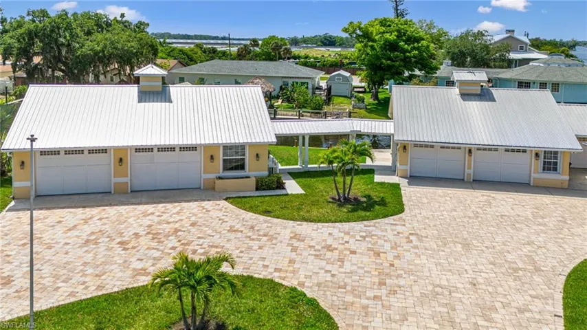Welcome to your riverfront oasis where luxury meets tranquility. Relax on your extensive lanai with panoramic screen while watching the boats glide by. This 4 br, 2 bth vaulted ceiling home has wide river views and a deep side canal perfect for docking large boats! Canal dock has been recently upgraded and painted and offers water and electric at the dock. Ample riverfront dock is made of composite wood. NUMEROUS UPGRADES throughout including new interior paint and flooring, complimented with plantation shutters. Whole house generator and 1,000 propane tank ensure you are never without power. Hurricane protection on windows and doors. There are 2 OVERSIZED 2 1/2 CAR GARAGES and the newest, built in 2018, boasts AC and water, along with a workshop. Both have walk up attics and include power lifts. Solar heated, saltwater pool is surrounded with travertine tile and there is an outdoor kitchen that has a wine cooler, icemaker, and cooktop. Huge circular drive with brick pavers and RV parking with hookup. Whole house RO system and security system. Experience the lifestyle of Riverfront living in a convenient location in beautiful SW Florida.